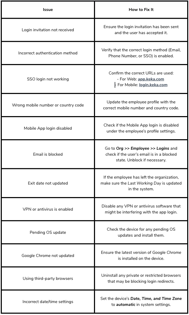 If an employee is unable to log in to the Keka Mobile App, use the checklist below to identify and resolve common login blockers: