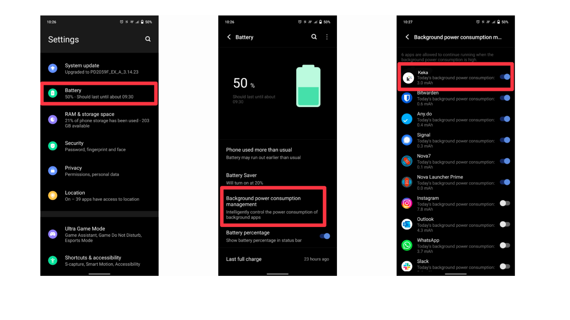 Go to Settings → Battery → Background power consumption management.