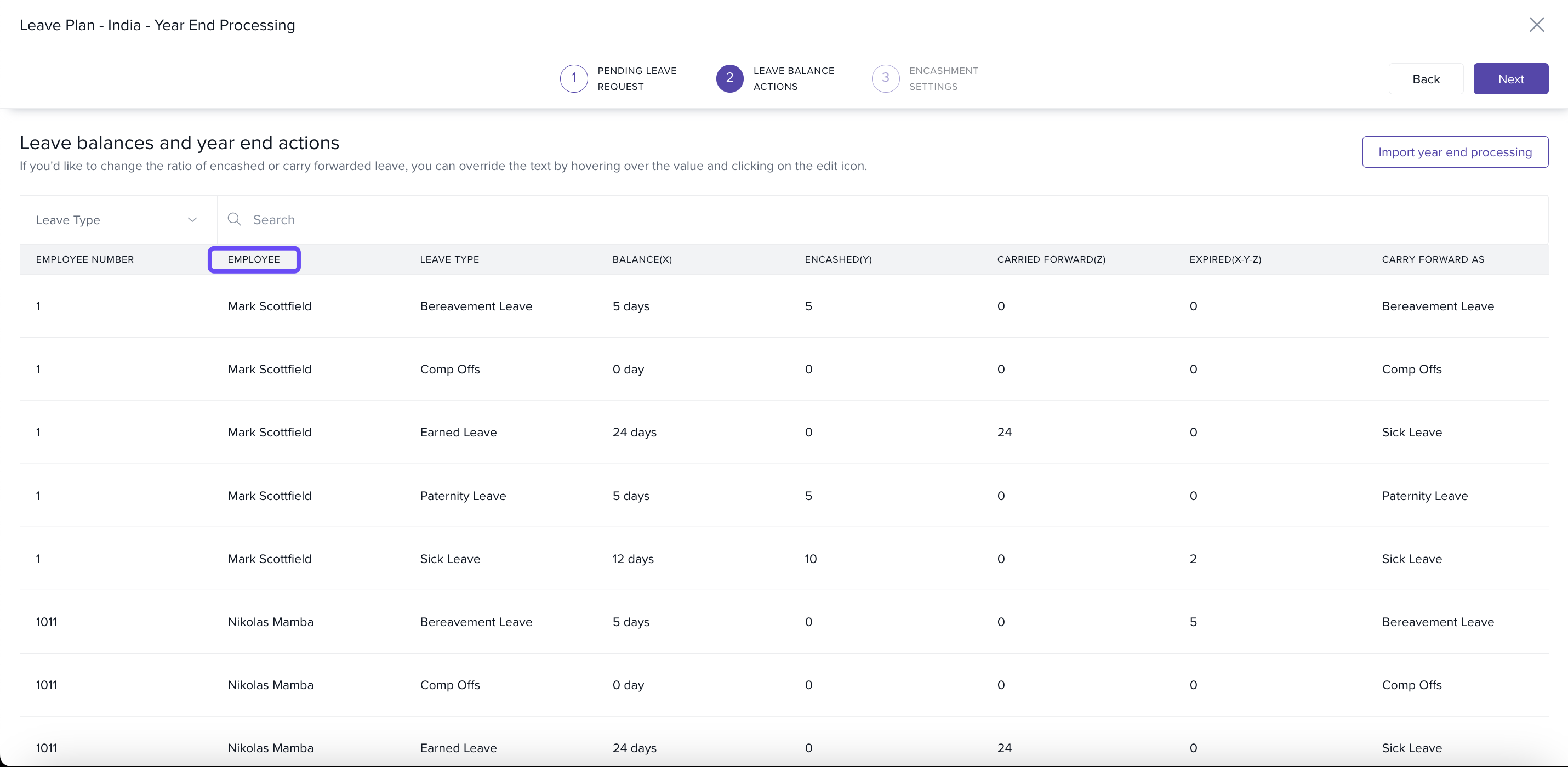 When you start YEP, Keka will display all employees who are eligible for leave encashment based on the formula you’ve defined. This list will automatically populate in the YEP processing flow.