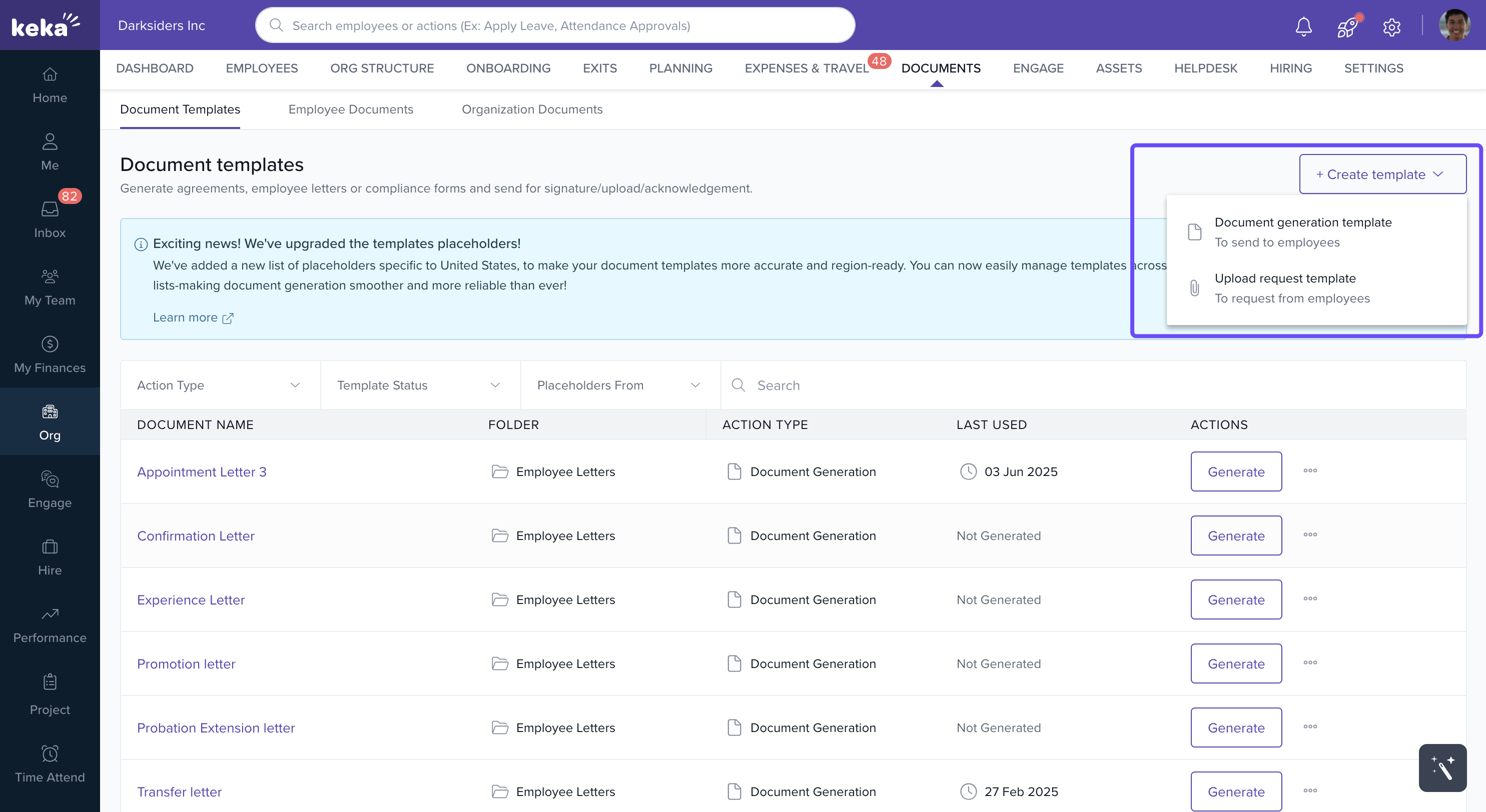 When creating a document template, you can add custom fields to capture specific information. These fields will appear as placeholders in the document, and when you generate the document, you’ll be prompted to fill in the required data. This is especially helpful in scenarios like creating personalized letters, certificates, contracts, or performance review documents, where every recipient has unique attributes.