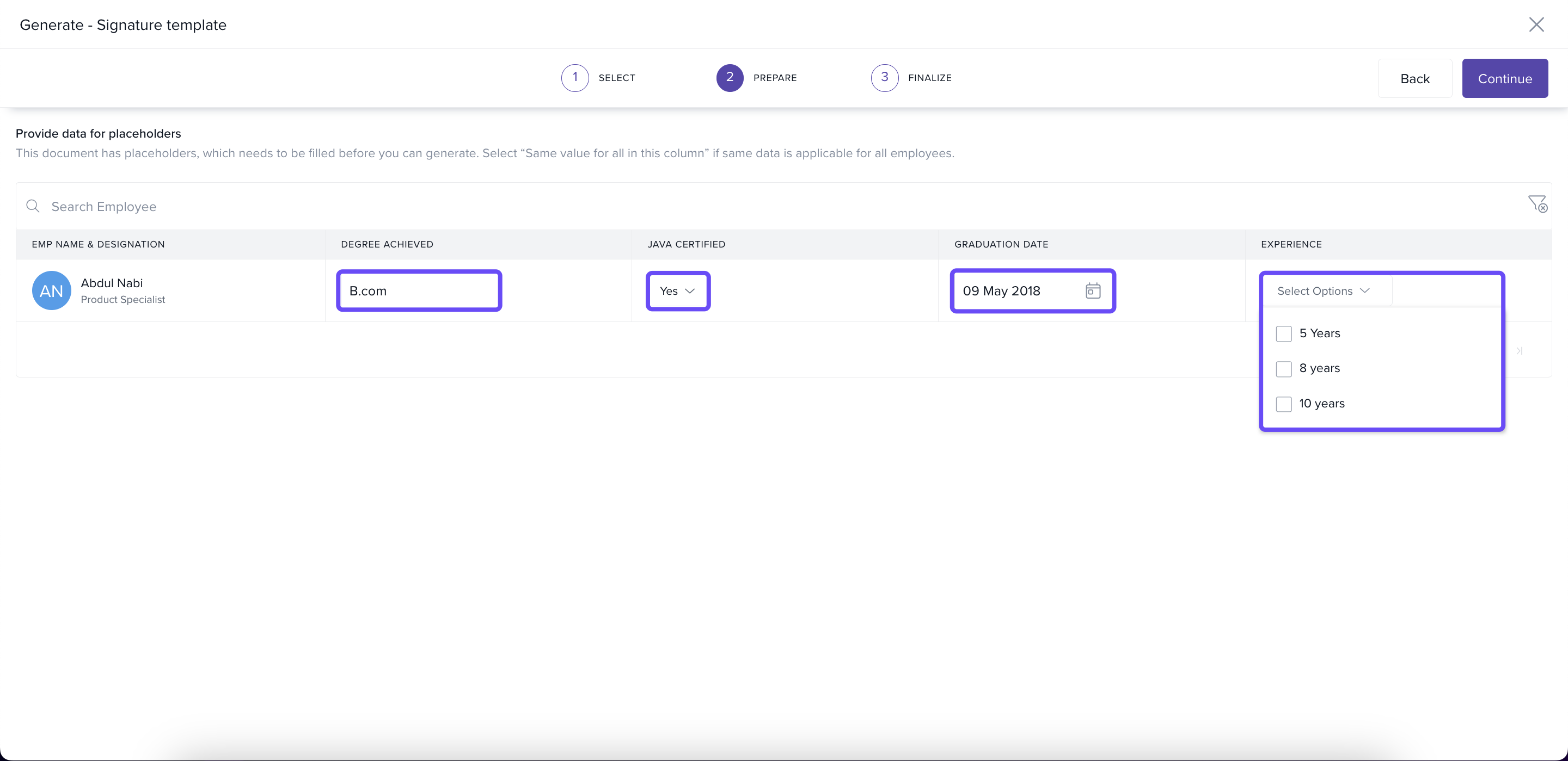 Step 2: In the "Prepare" section, you’ll see a list of the custom fields you created earlier (like Degree Achieved, Java Certified, Experience, etc.). Here, you will be prompted to provide specific data for each placeholder: