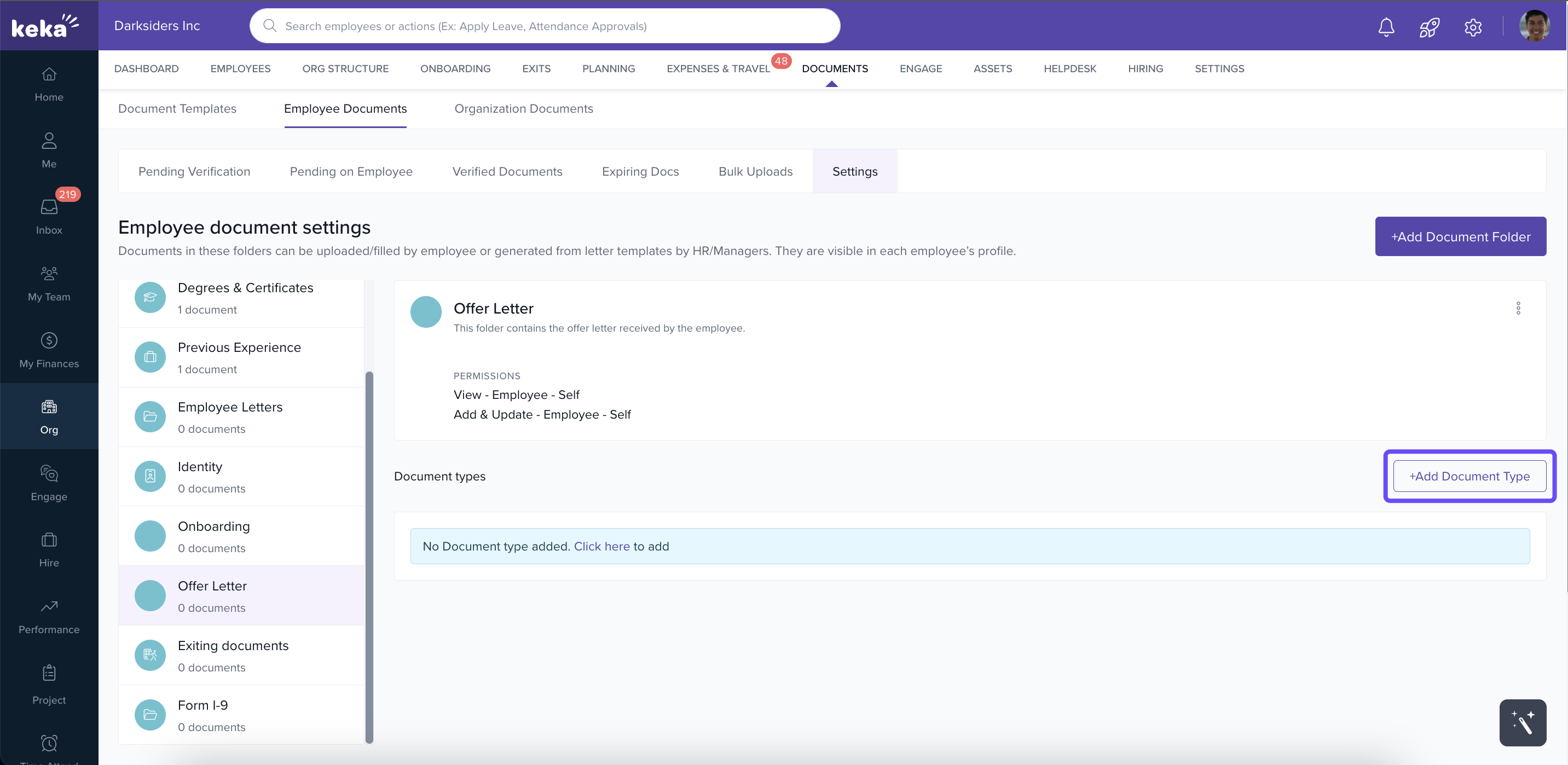In the left pane, select the folder where you want to add a document type (e.g., Offer Letter).