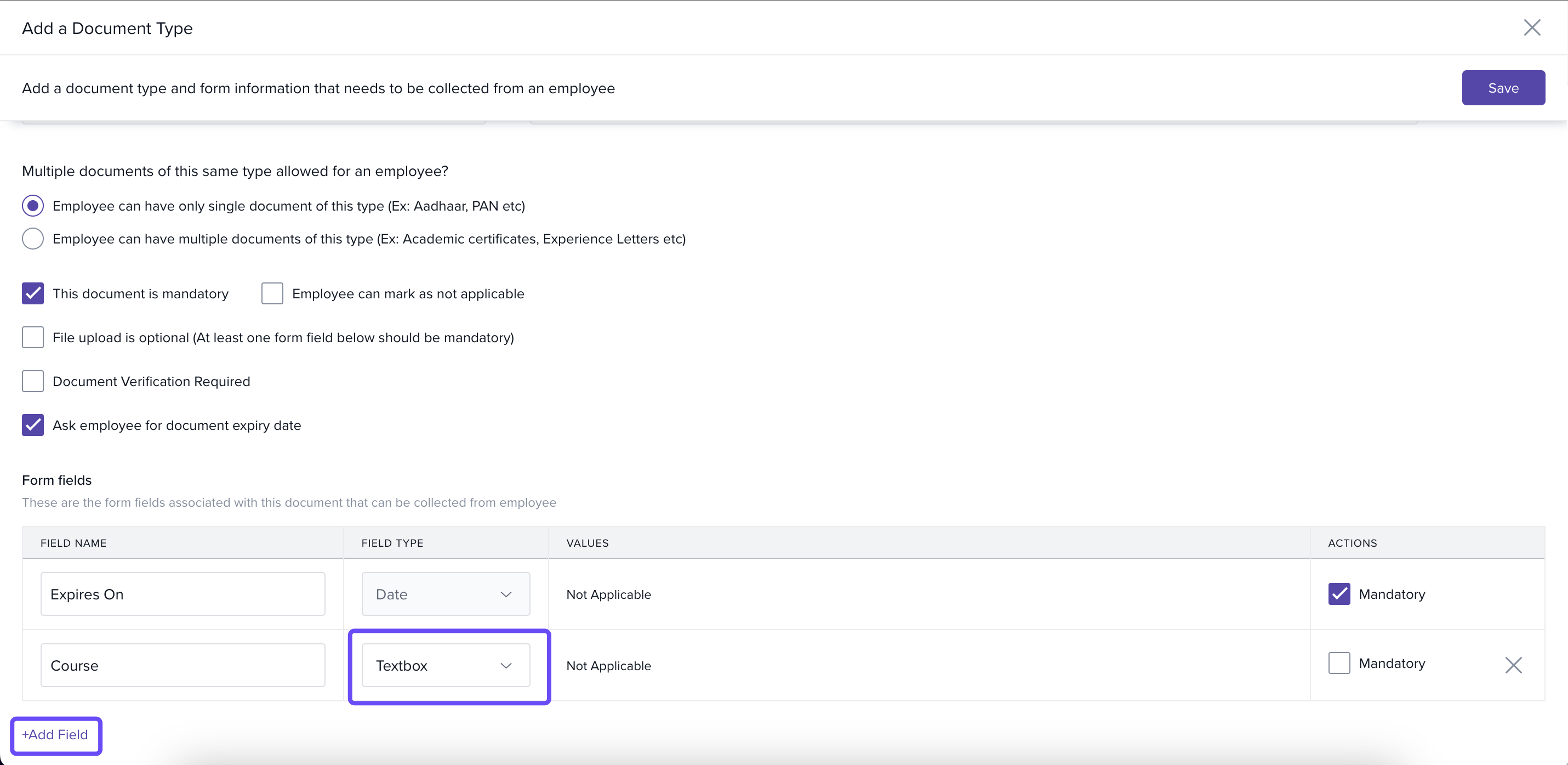 When defining a document type, you can add form fields to collect extra information from employees beyond just uploading a file. These fields appear during the document upload process.