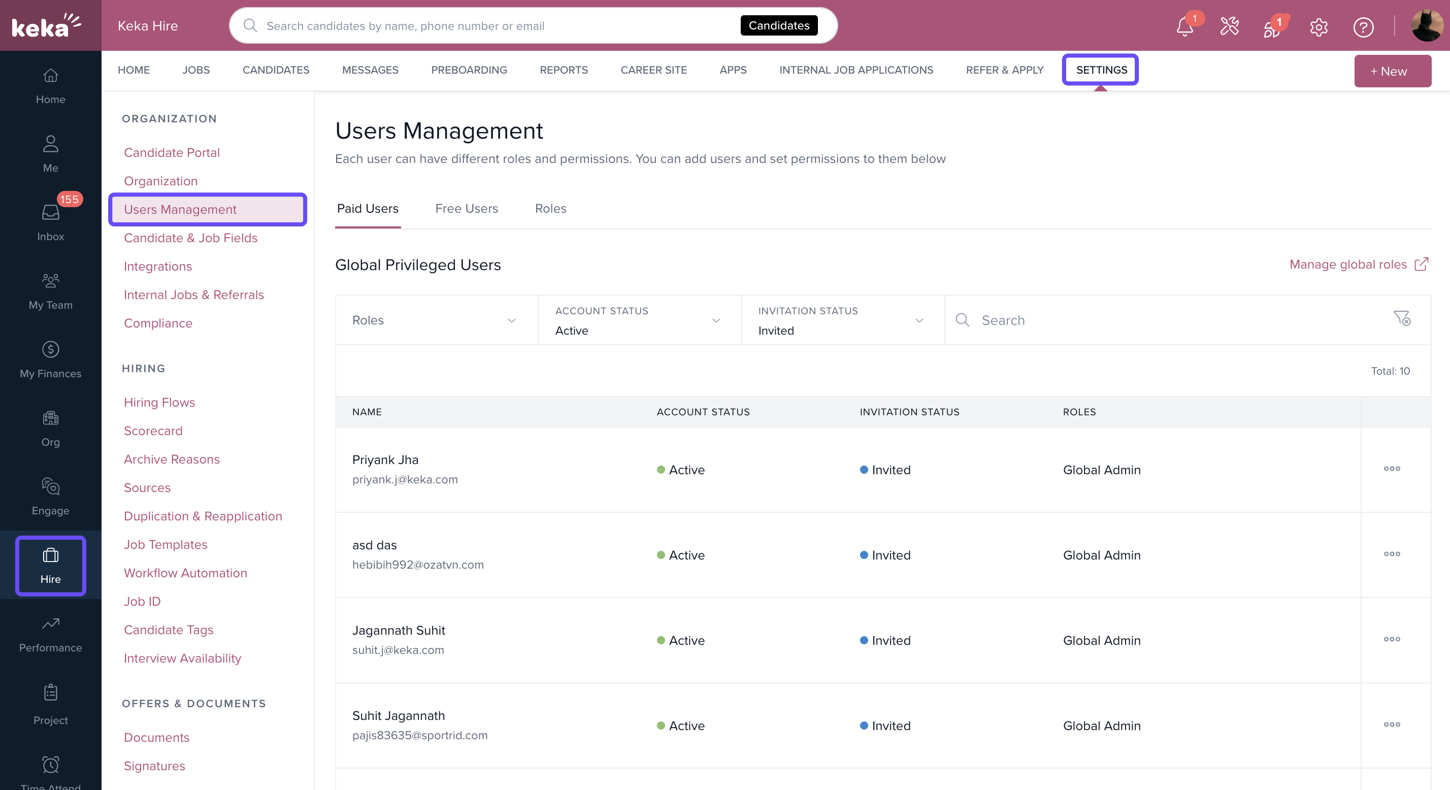 Go to: Hire > Settings > User Management