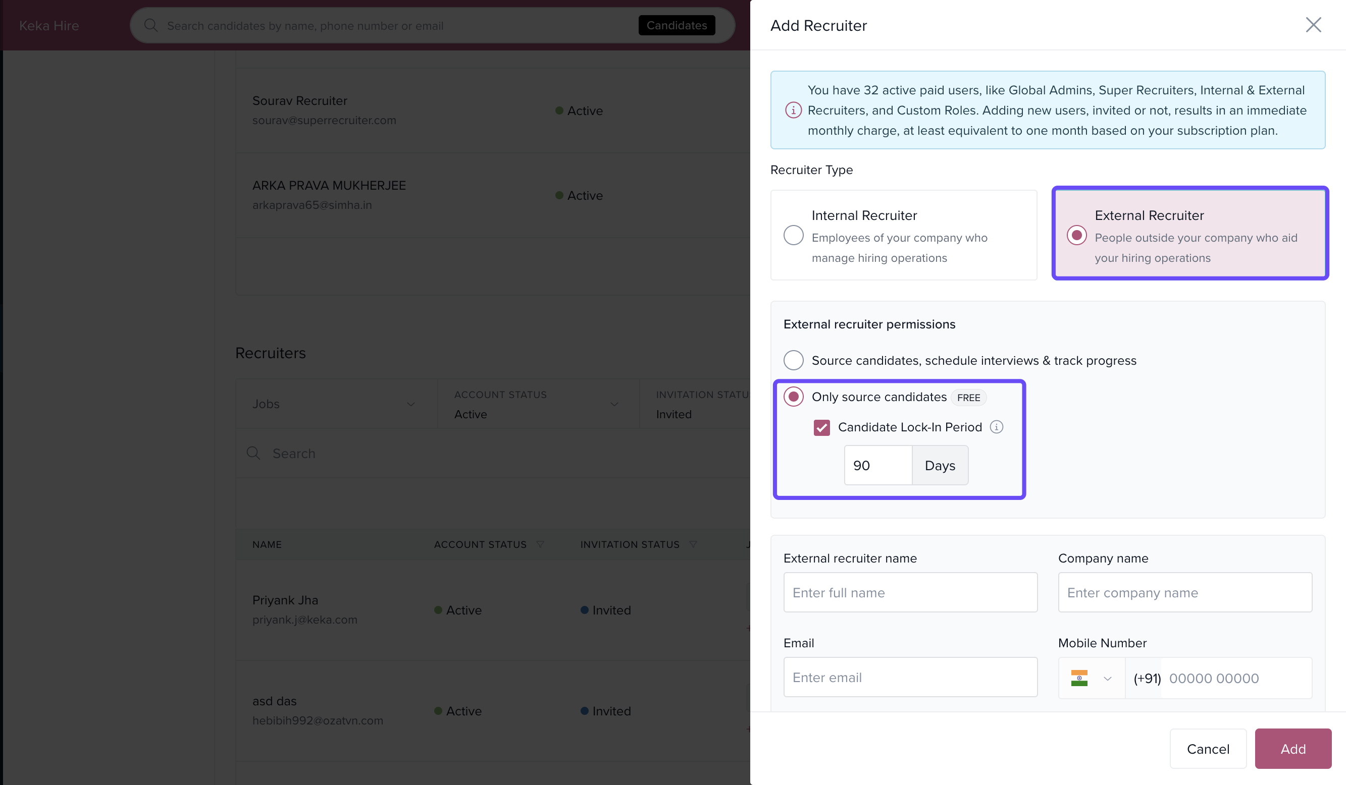 To help organizations manage vendor relationships more fairly and avoid disputes, Keka Hire now supports a lock-in period for candidates sourced by External Recruiters (Only-Sourcing) — also called EROS.