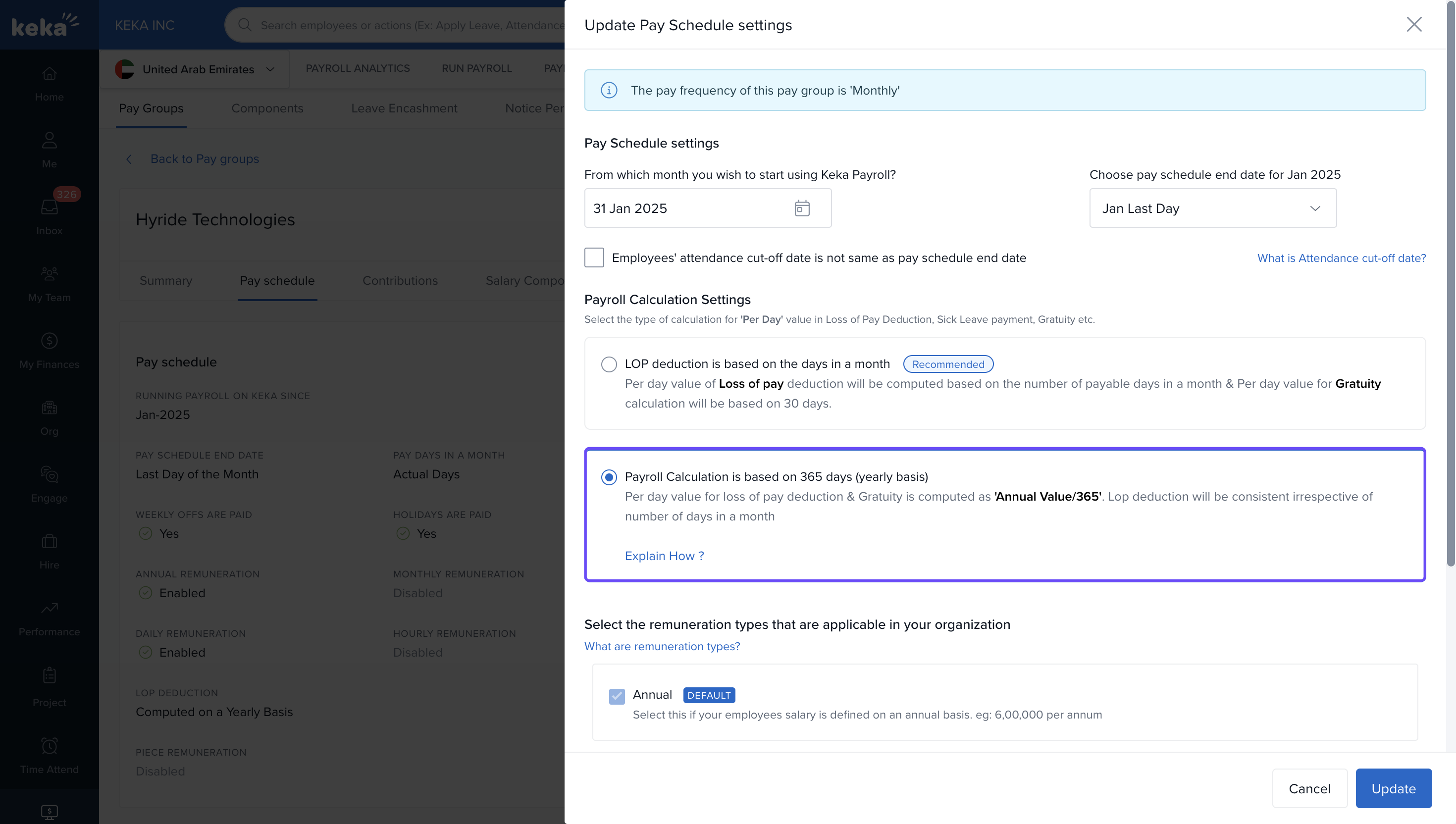 A toggle will be introduced in Pay Schedule Settings allowing companies to choose between 30-day or 365-day gratuity calculation.