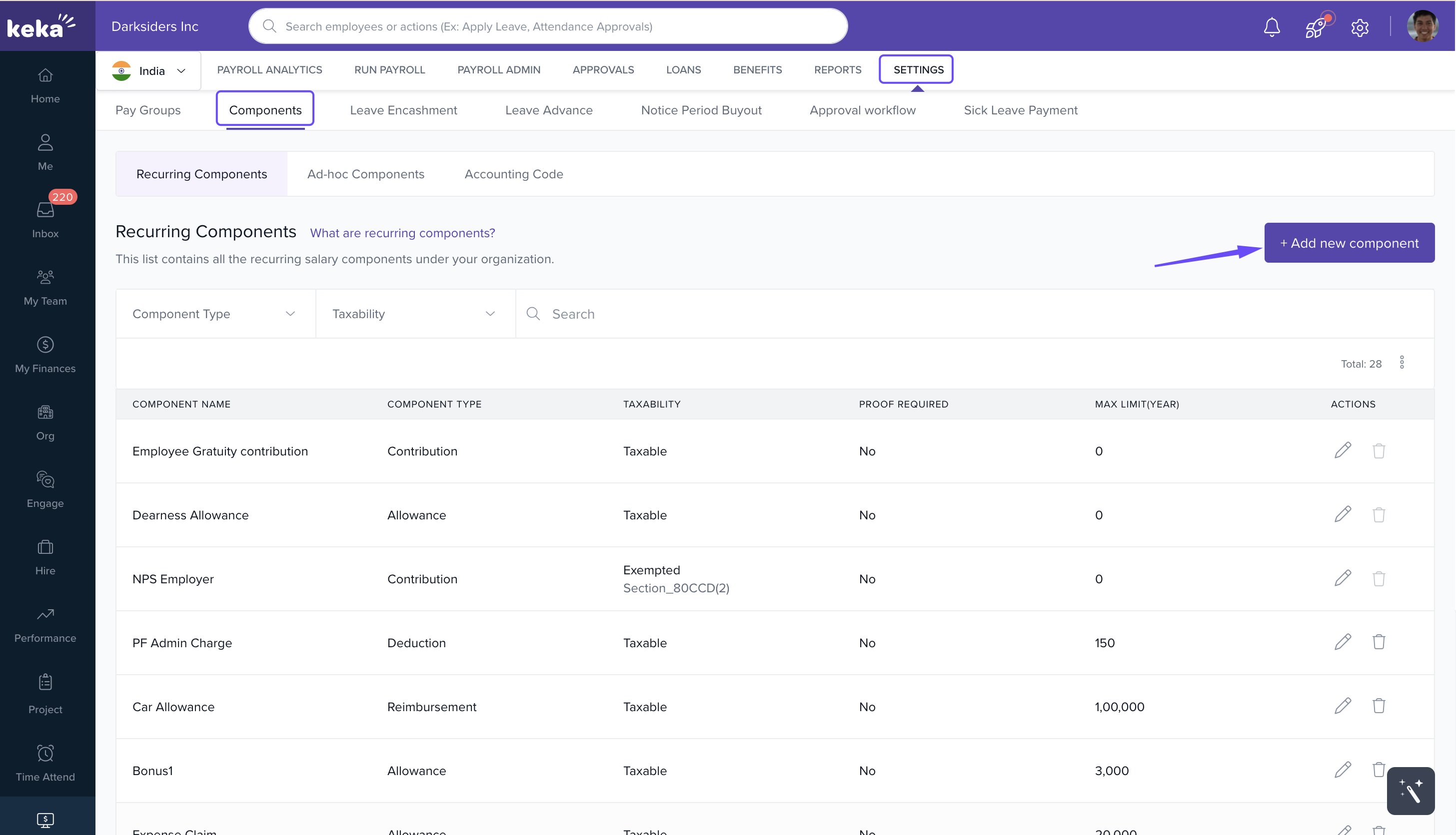 Go to Payroll Settings > Components.