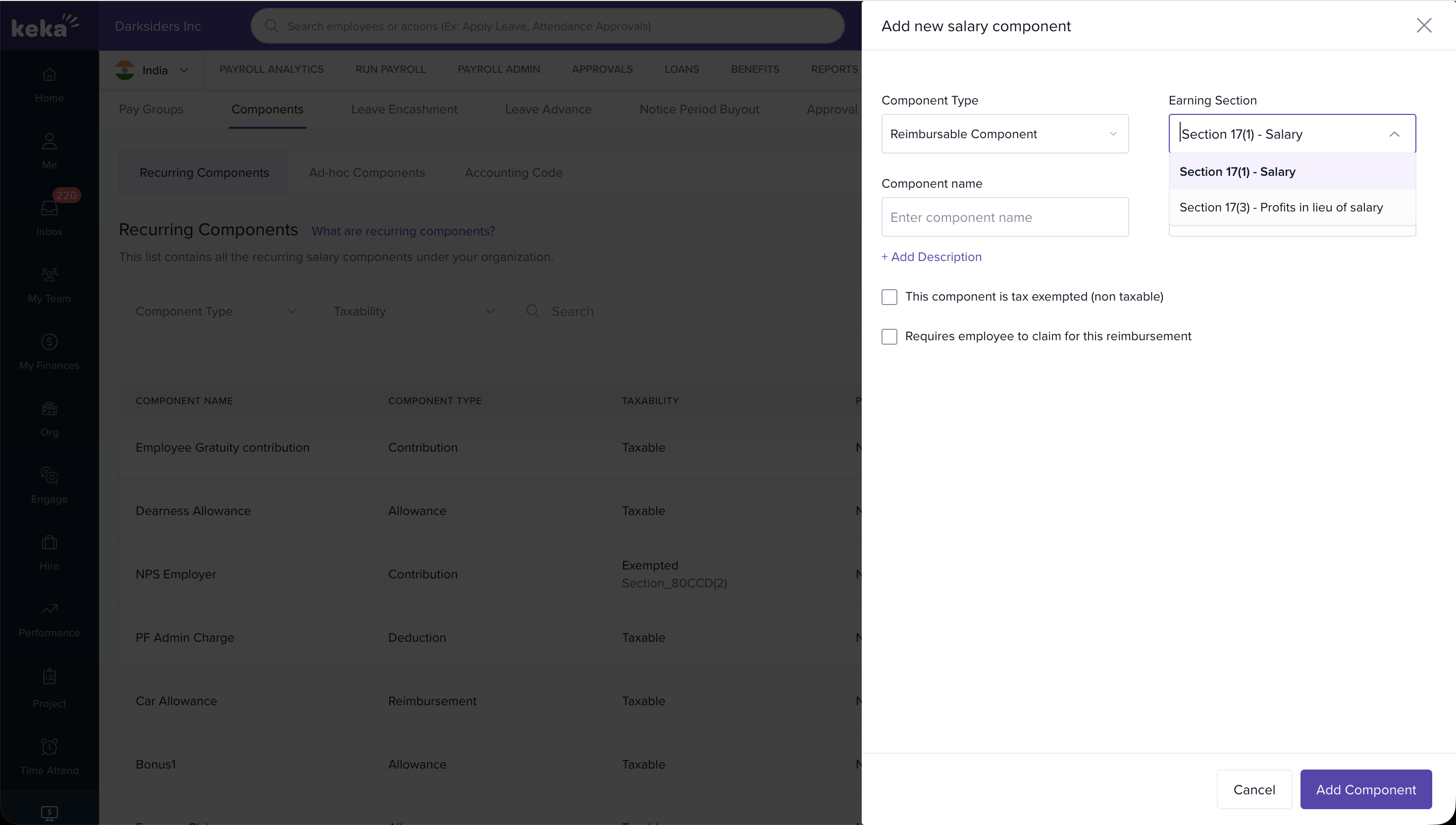 Keka now allows you to classify eligible salary components under income tax earning sections — Section 17(1) and Section 17(3) — as per Indian tax rules. This classification helps ensure accurate tax reporting across all statutory forms and reports.
