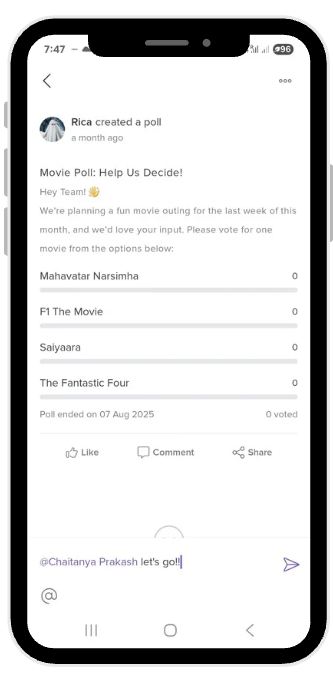 You can scroll through the feed to catch up on team activities, recognitions, and interactive updates.