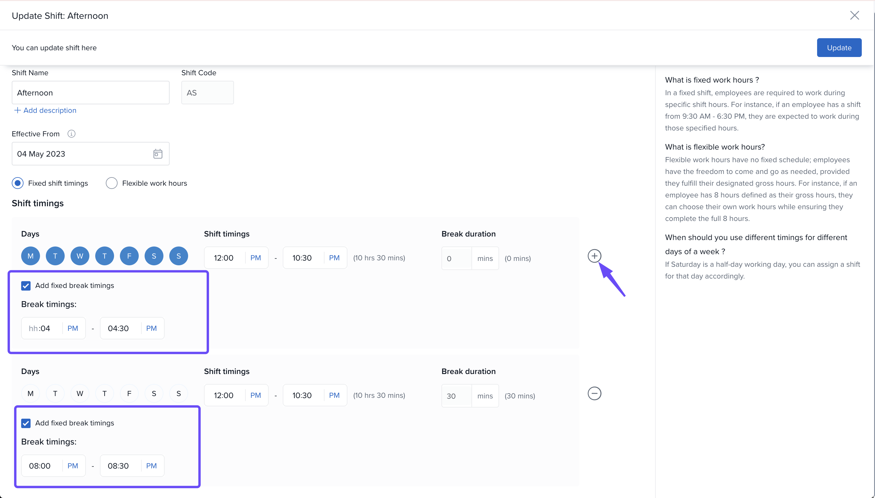 If you want to add more than one break for the same shift, click the + icon on the right and define additional fixed break timings.