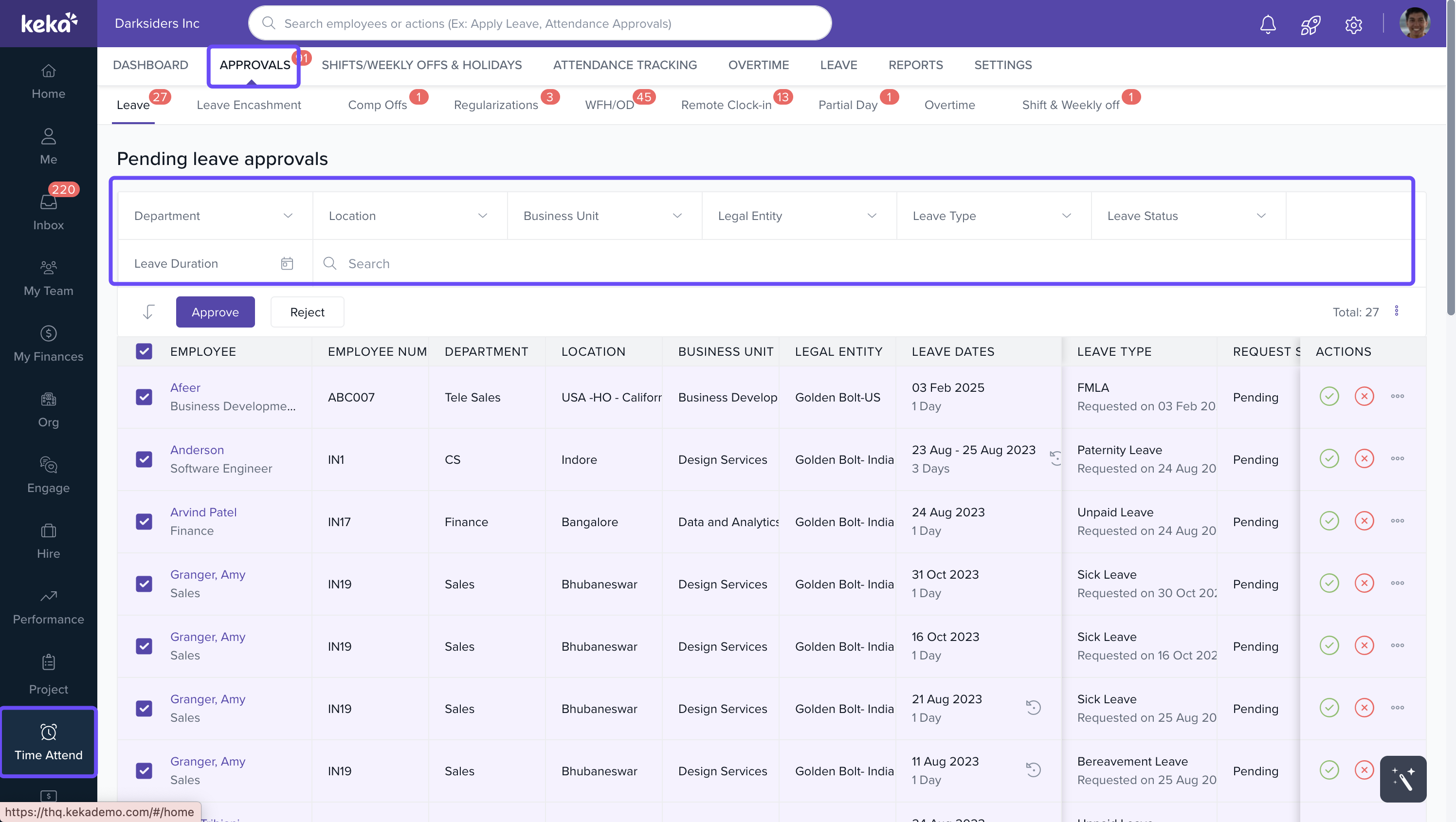 Note: Approvals can now be filtered by Business Unit, Legal Entity, Employee ID/Number, date ranges, and other context-specific criteria. An Employee Number column is available across all approval tables for accurate identification. WFH/OD request-type filters, OT-specific date filters, and consistent filter behaviour across all approval tabs are also included.