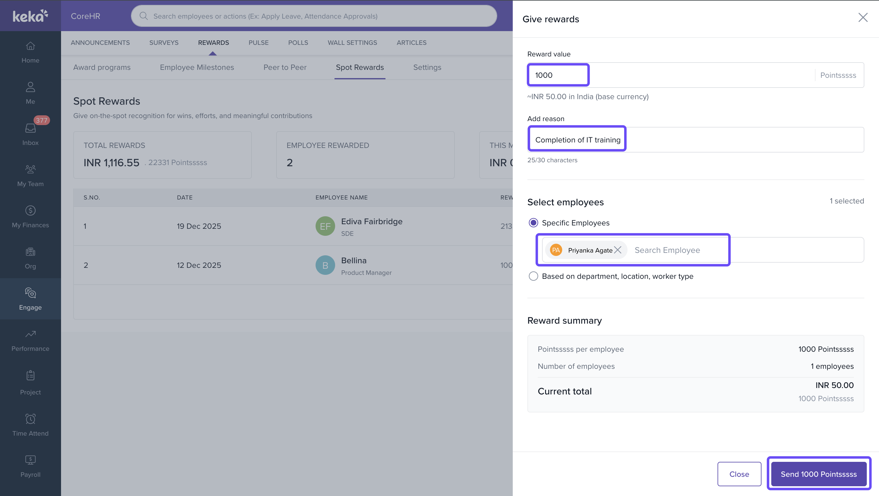 | Reward value | Number of points to distribute per employee | Shows INR equivalent in base currency |