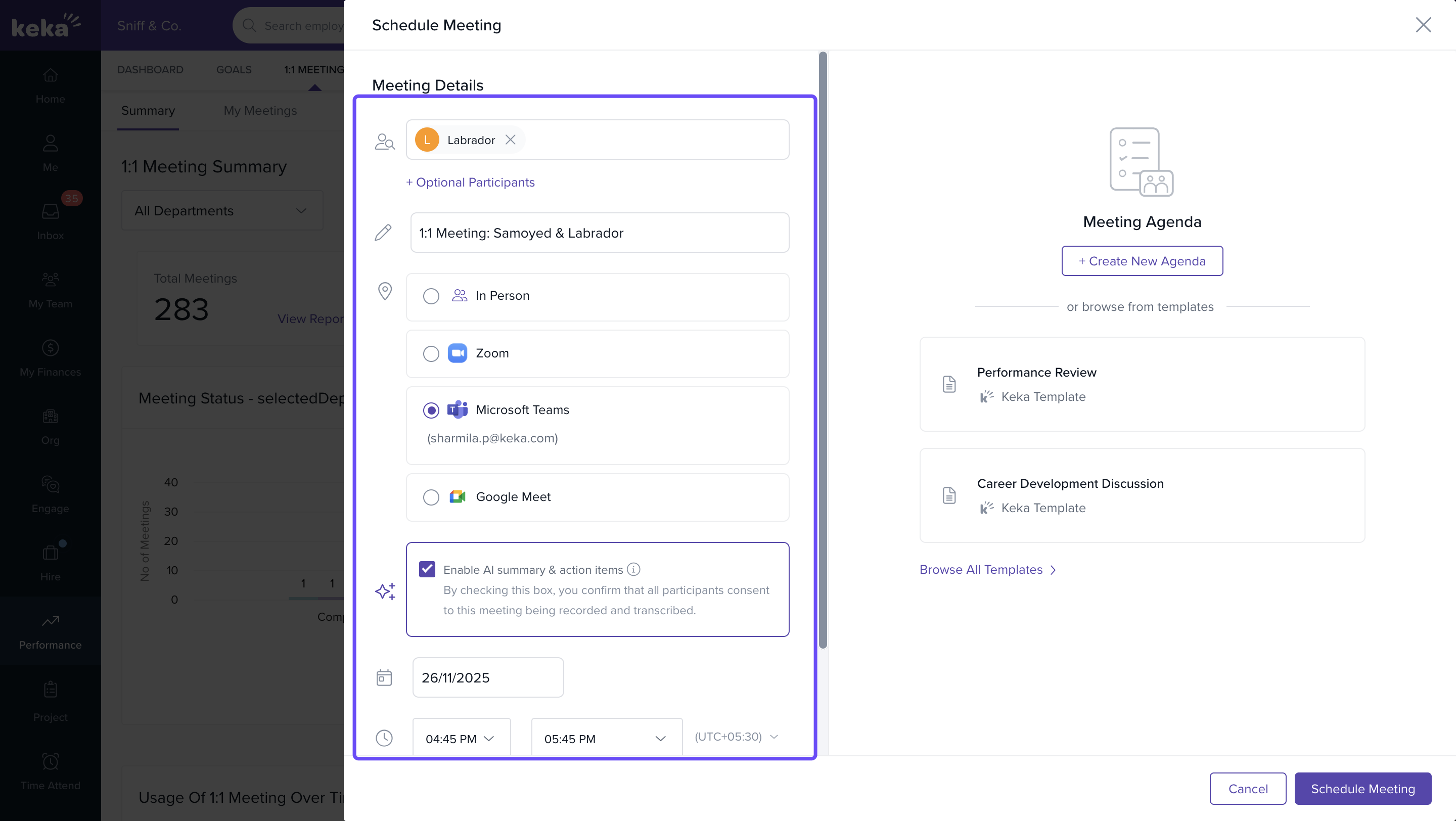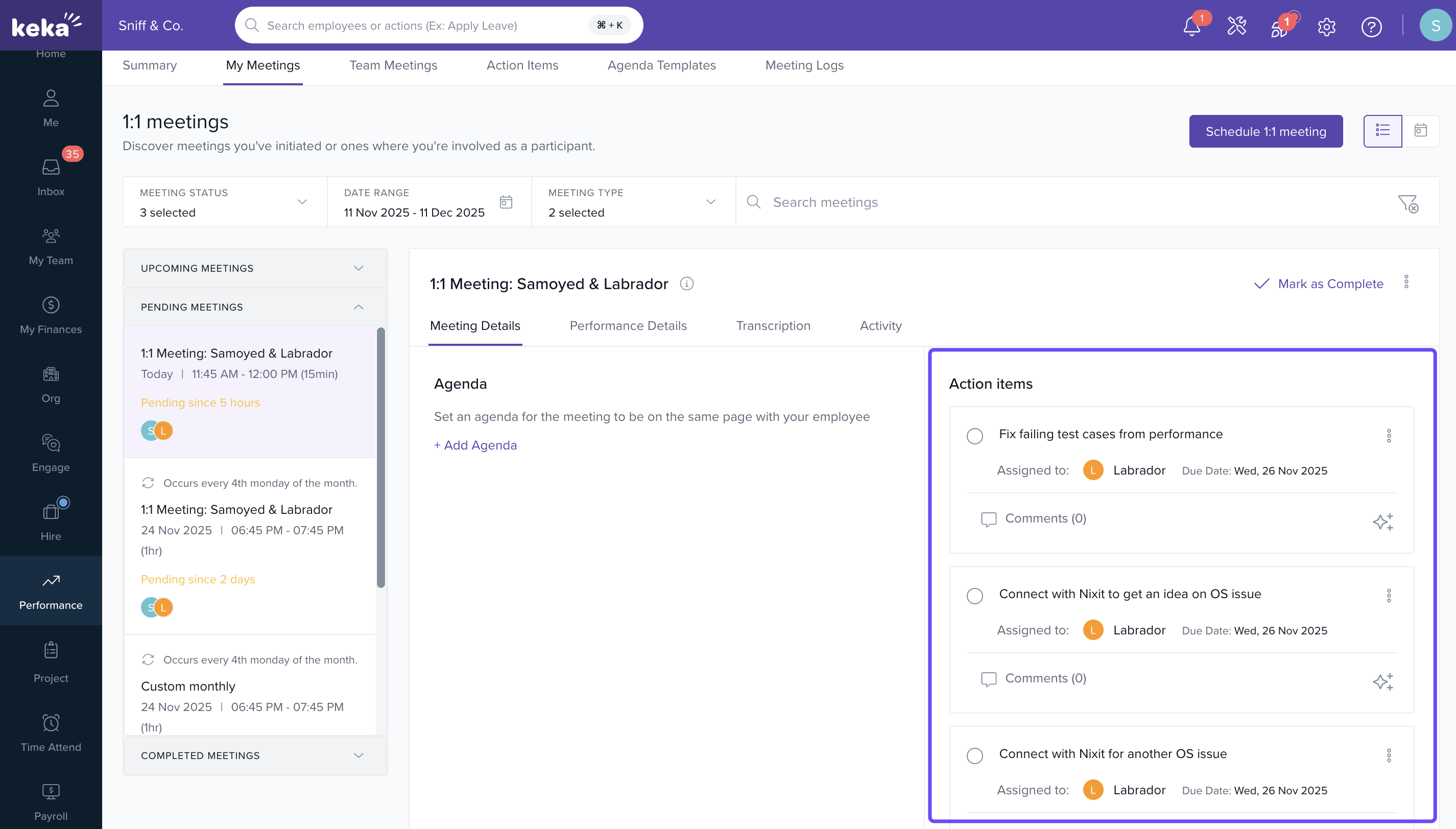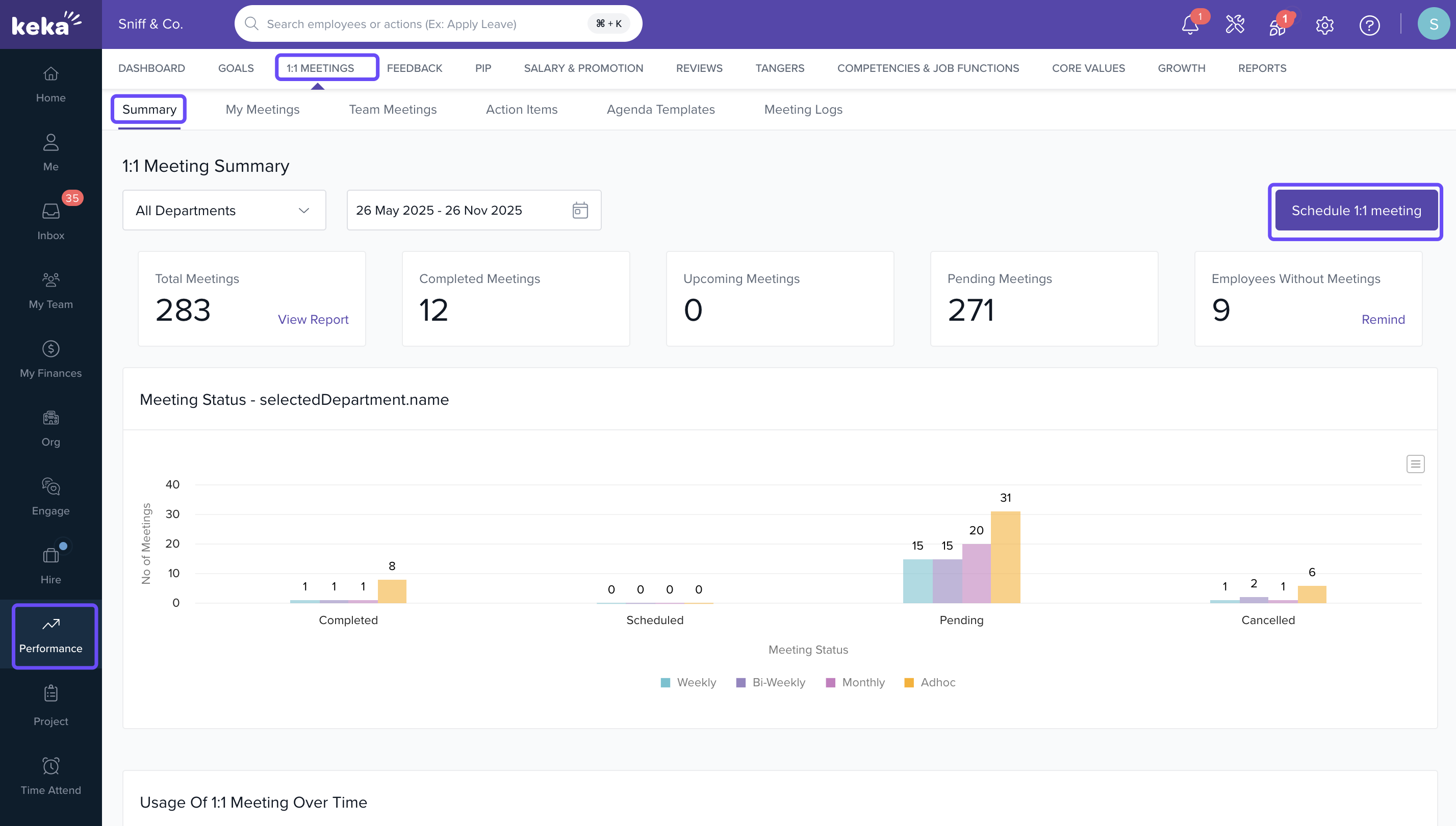 Schedule a 1:1 Meeting under the Performance > 1:1 Meetings section.