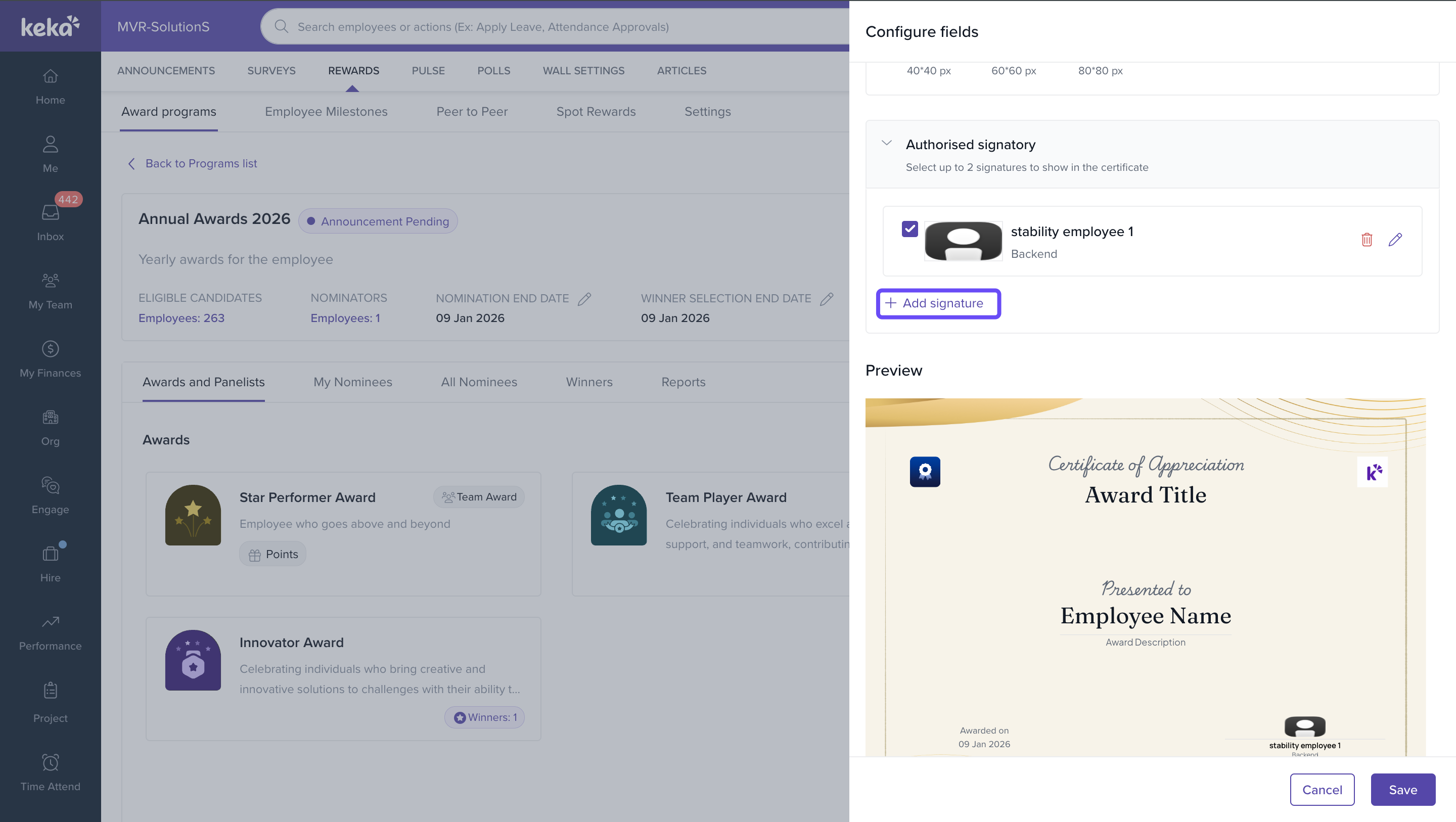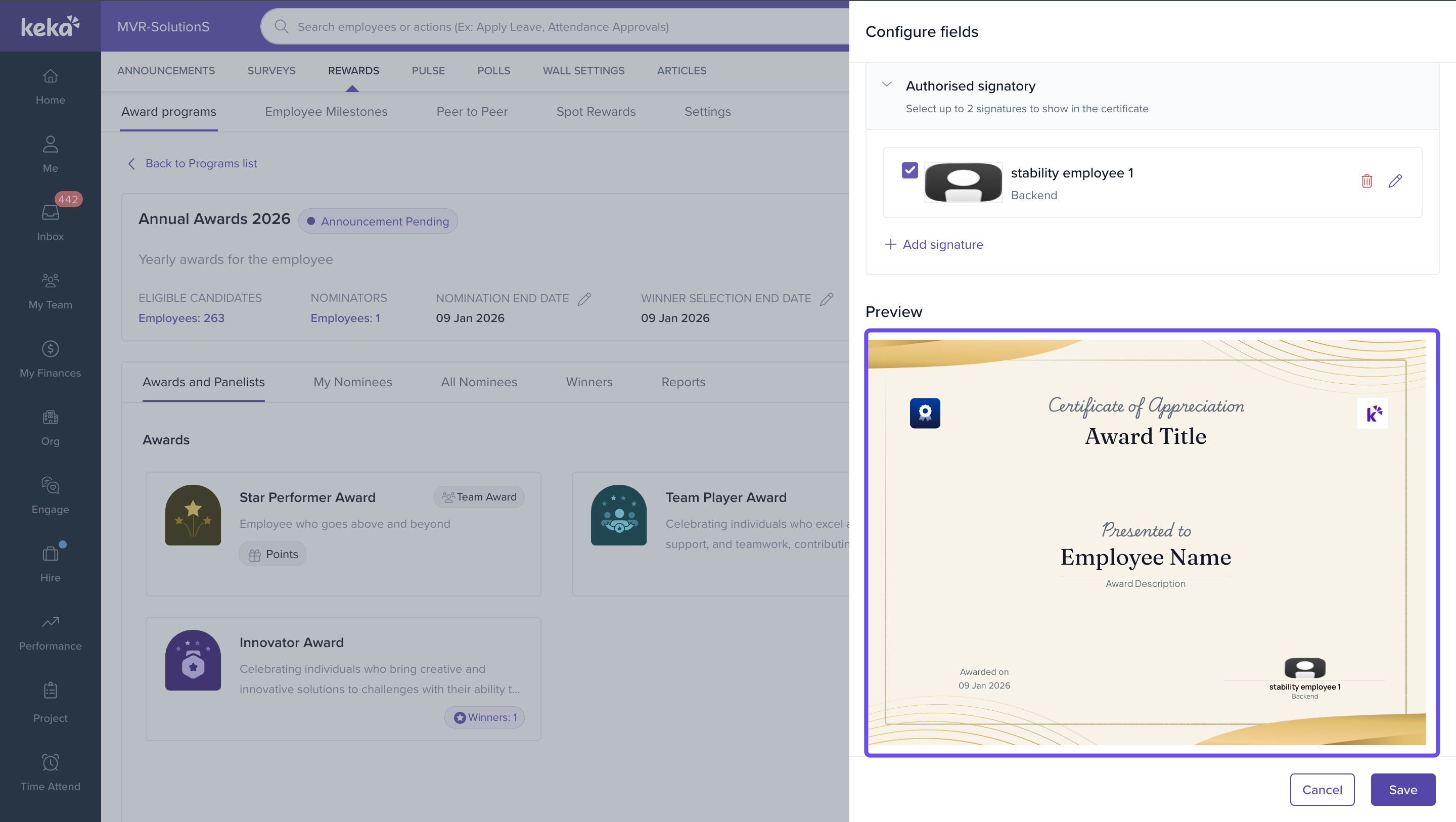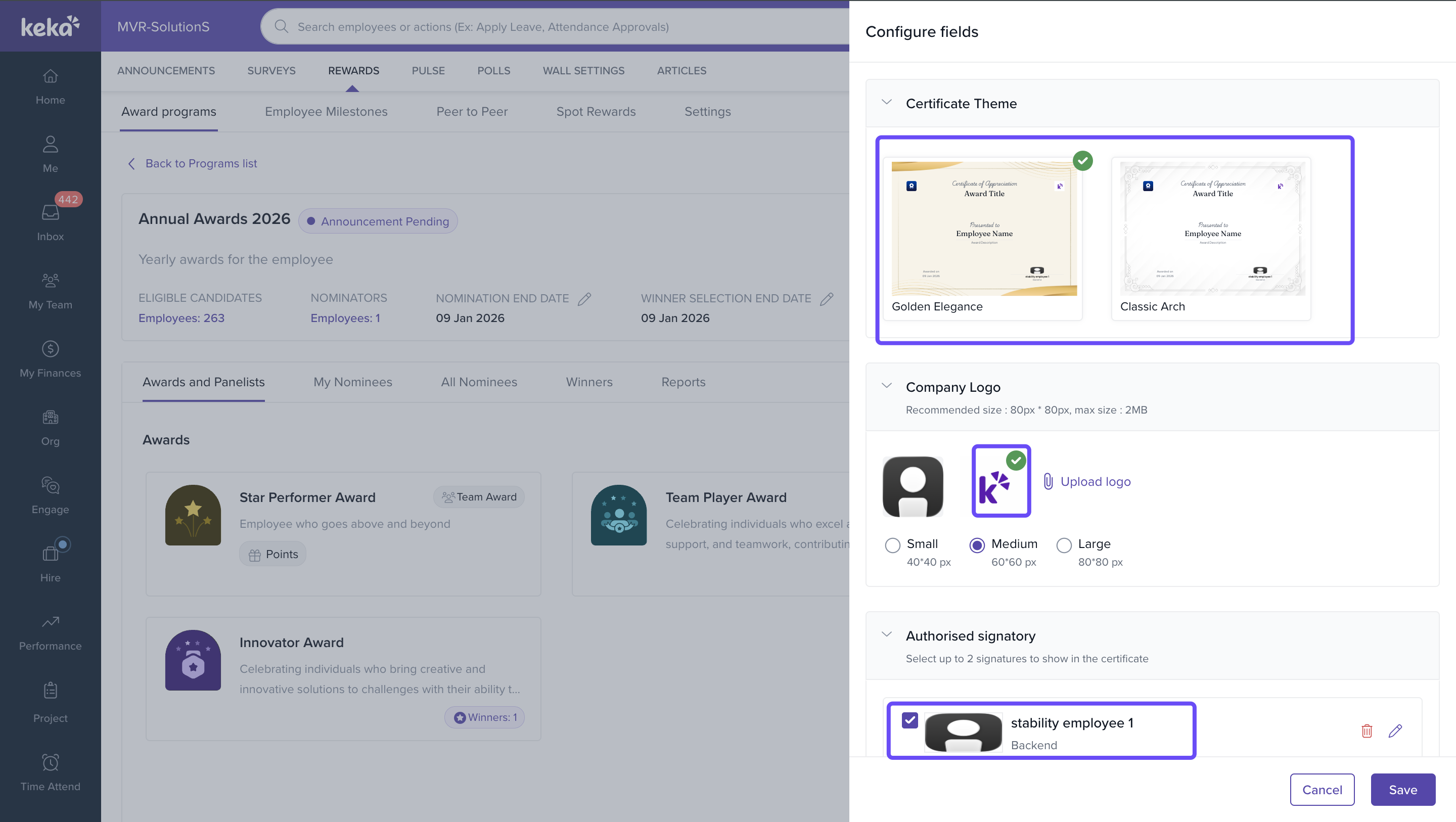 Keka now allows admins to customise award certificates in Award Programs. You can tailor certificate visuals and content—such as logos, write-ups, and signatures—so that every certificate aligns with your company’s identity and recognition culture.