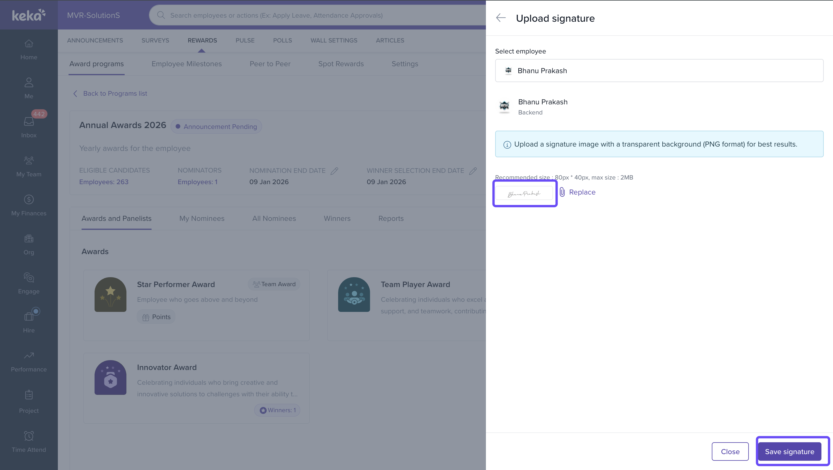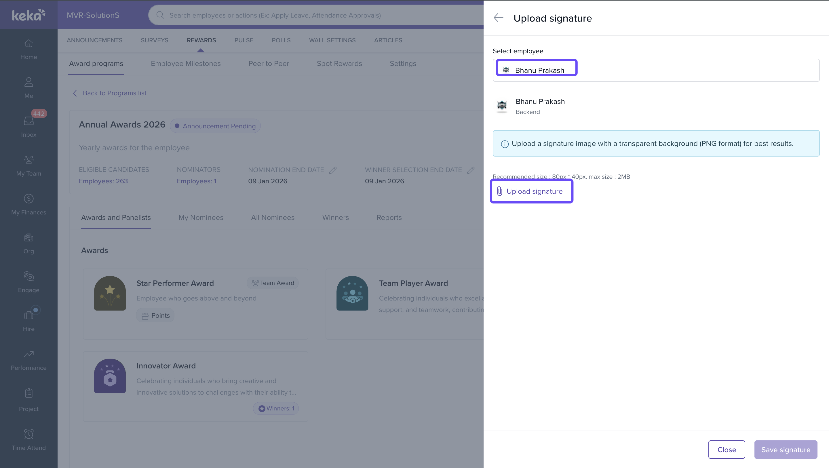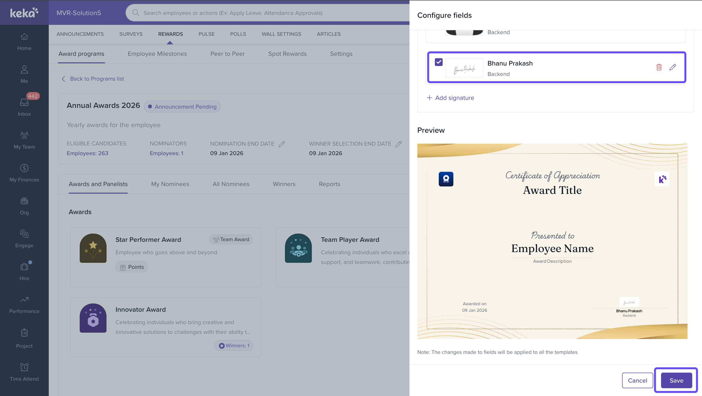 Keka now allows admins to customise award certificates in Award Programs. You can tailor certificate visuals and content—such as logos, write-ups, and signatures—so that every certificate aligns with your company’s identity and recognition culture.