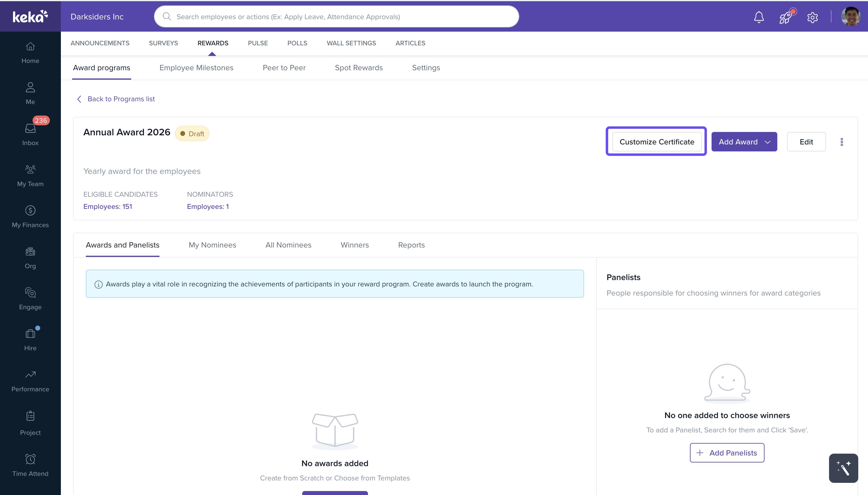 - You can personalise the award certificate anytime—before or after launching the program. In this example, we're doing it after closing nominations.