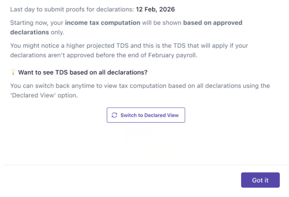 During the approval month, when you visit the IT Declarations page, you’ll see a mandatory pop-up: