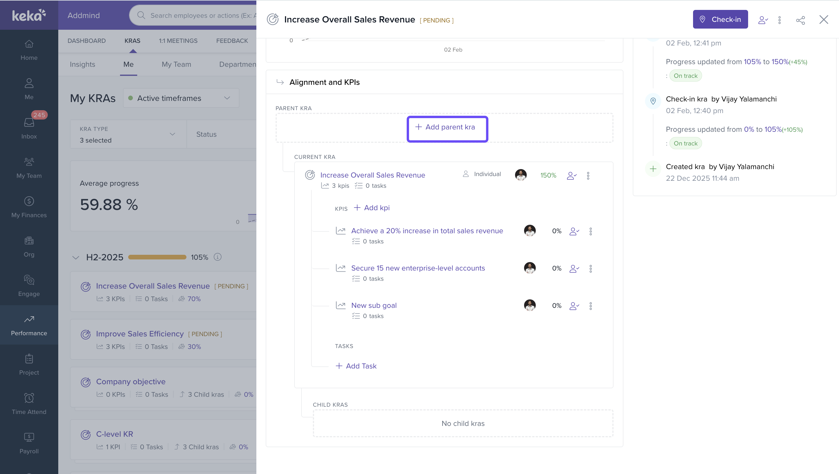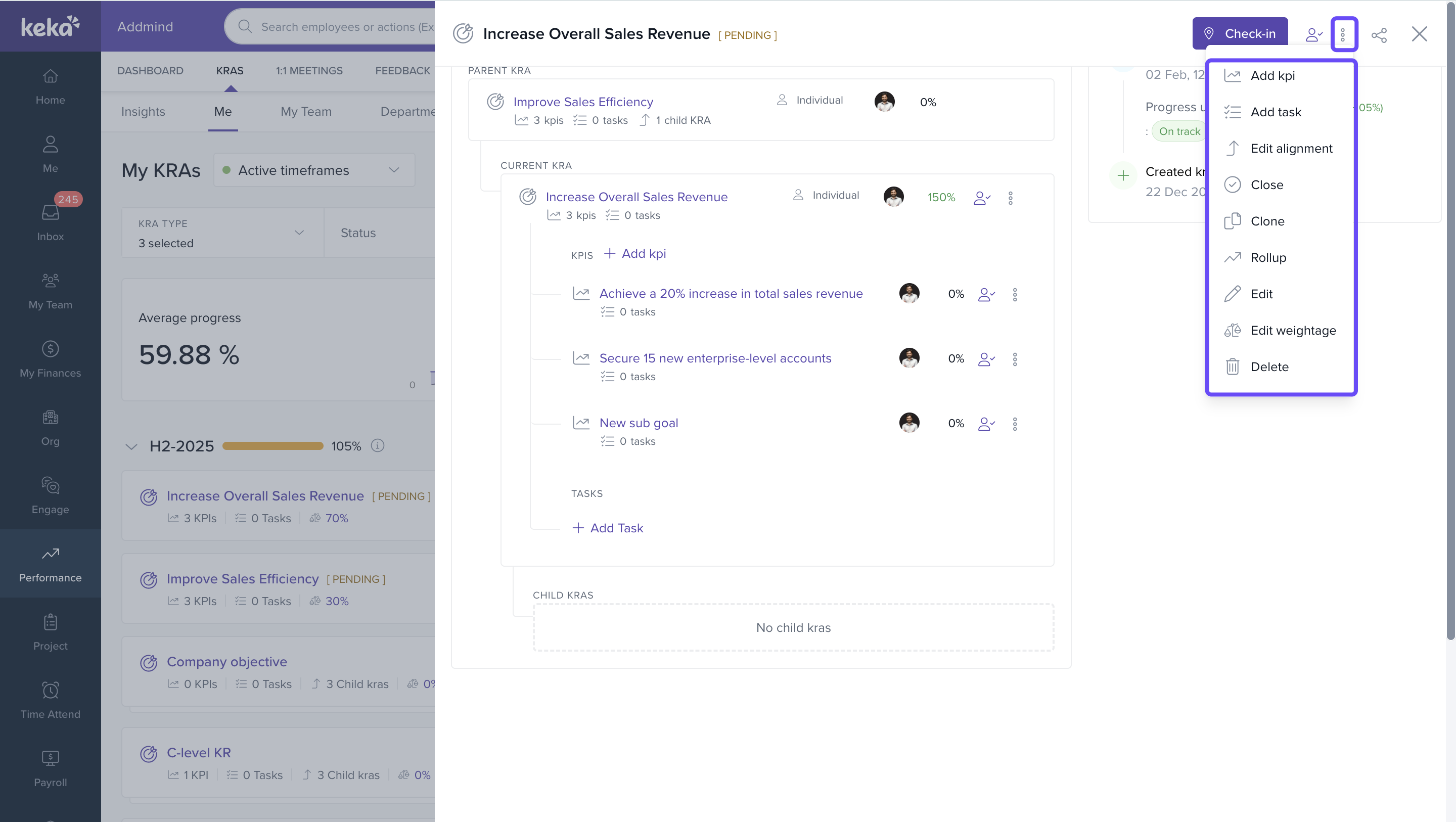 All goal-related actions (edit, add KPI, add task, align, close, clone, delete, edit weightage) can be performed without leaving the slider.
