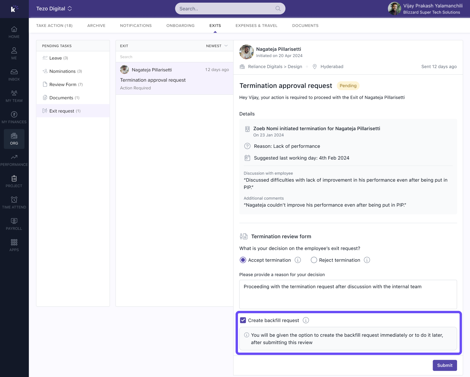 - Raise a backfill requisition directly during exit approval