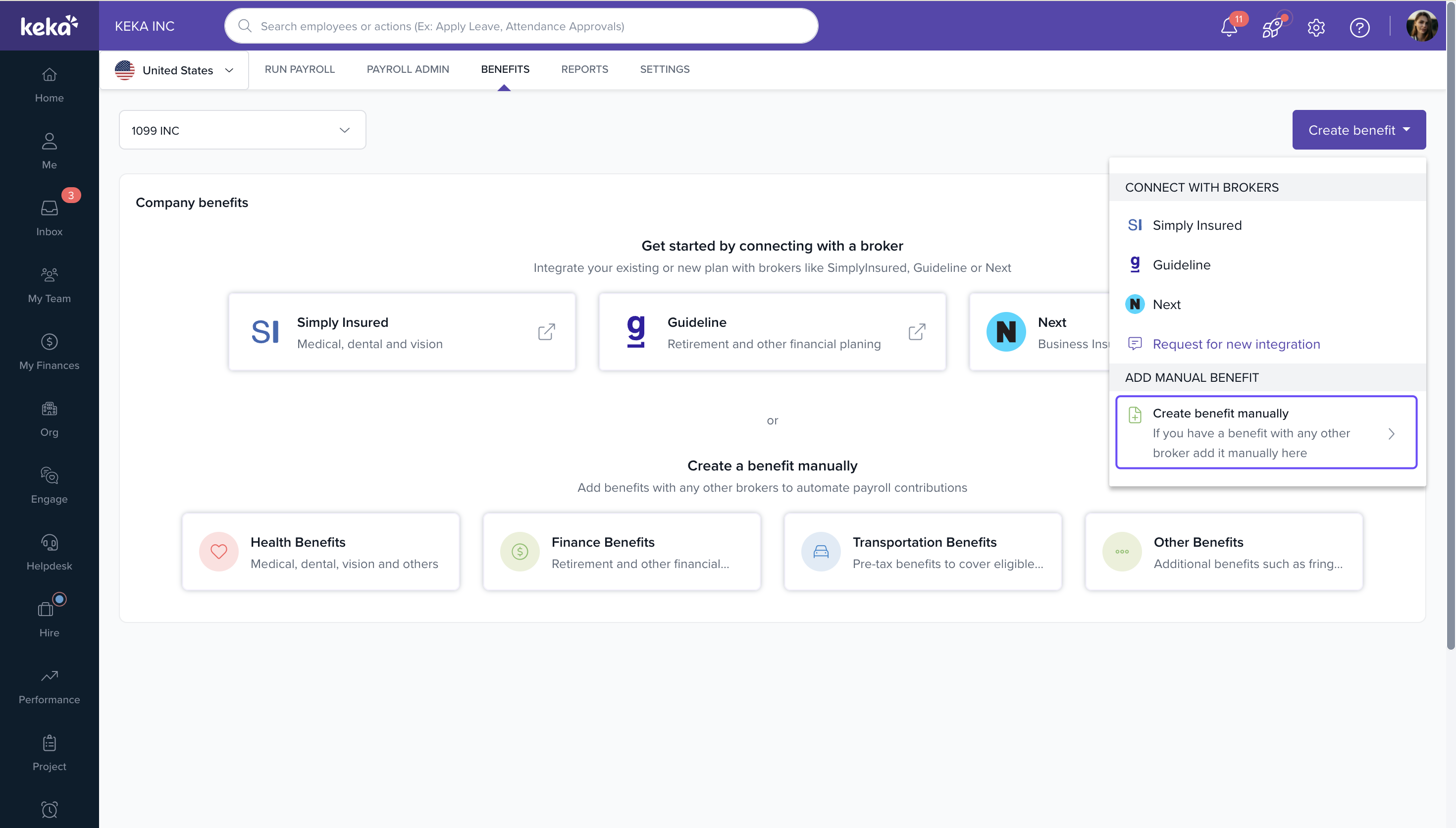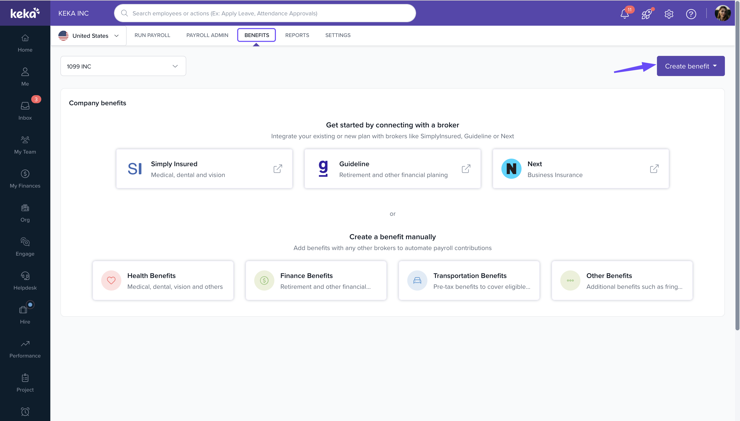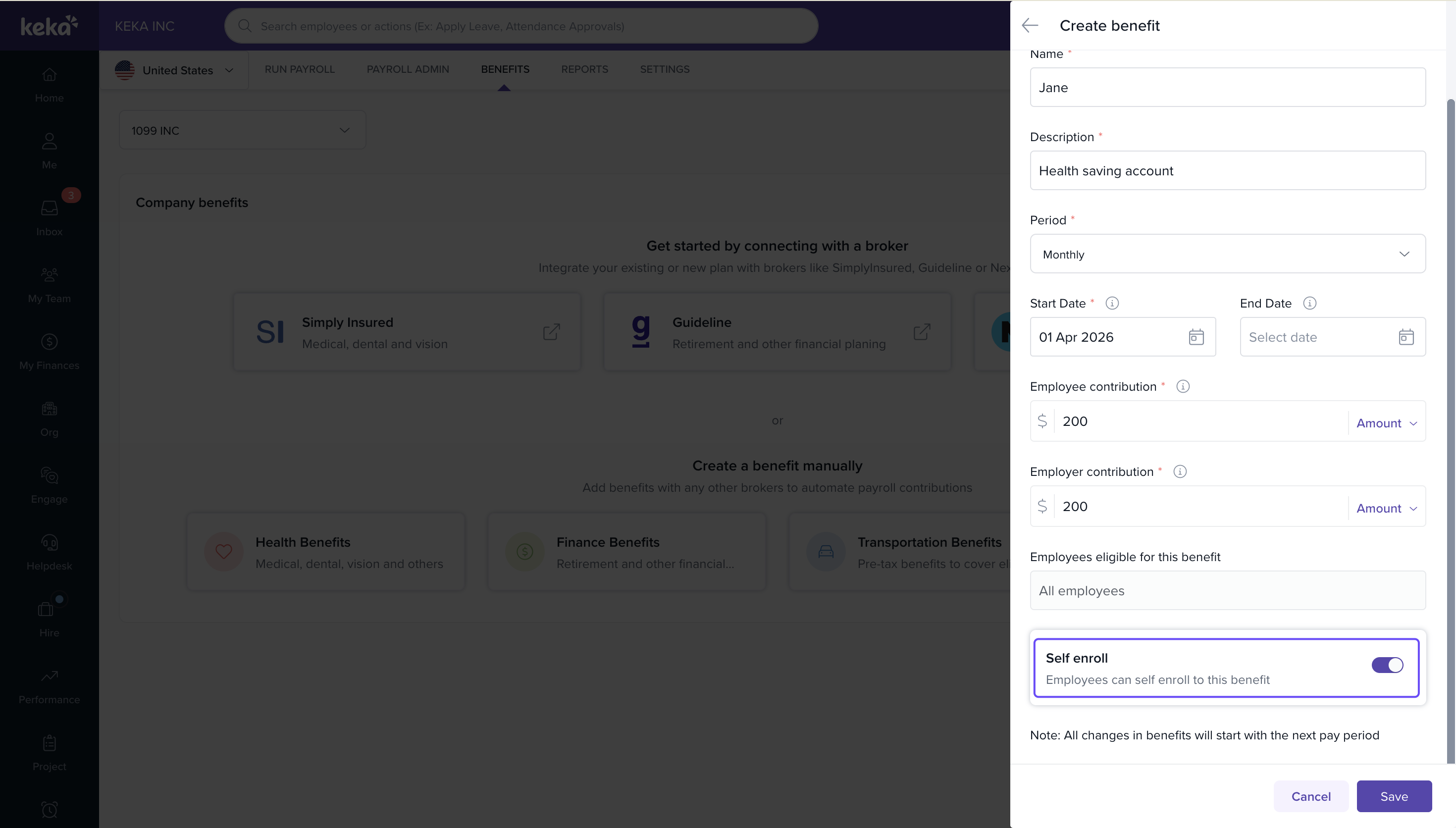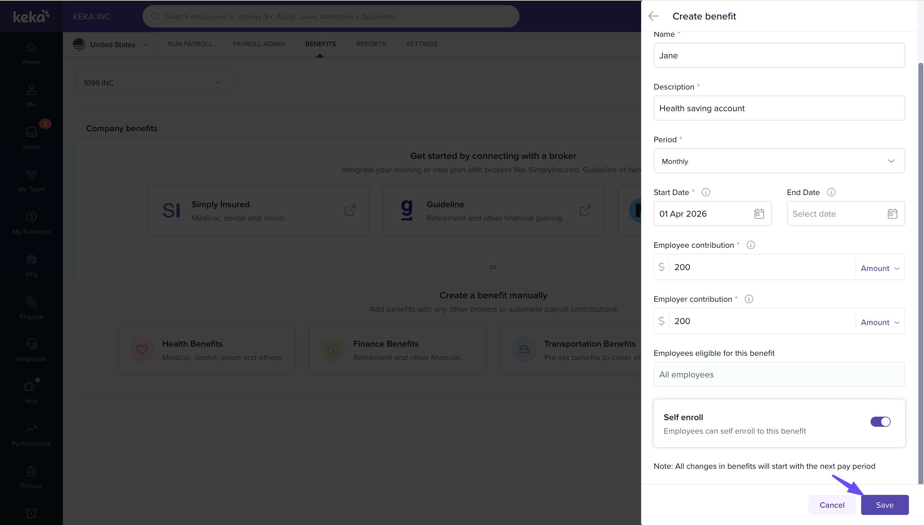 Navigate to Payroll → Benefits → Create Benefit
