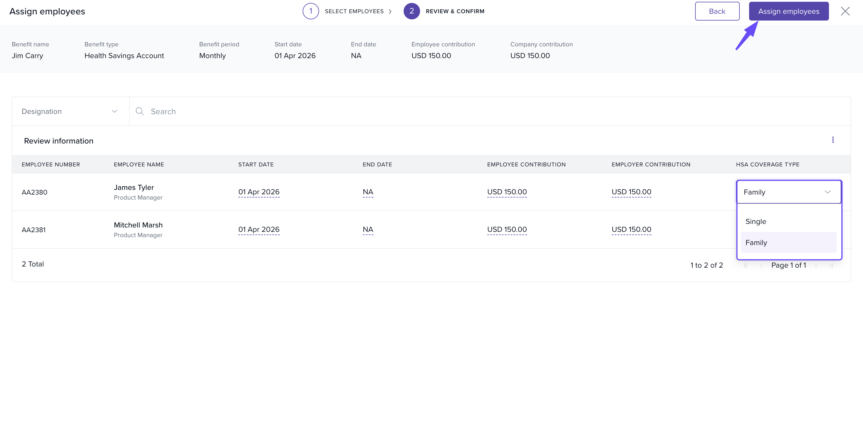 3. In the HSA section, click on the three dot, and select Assign Employees.