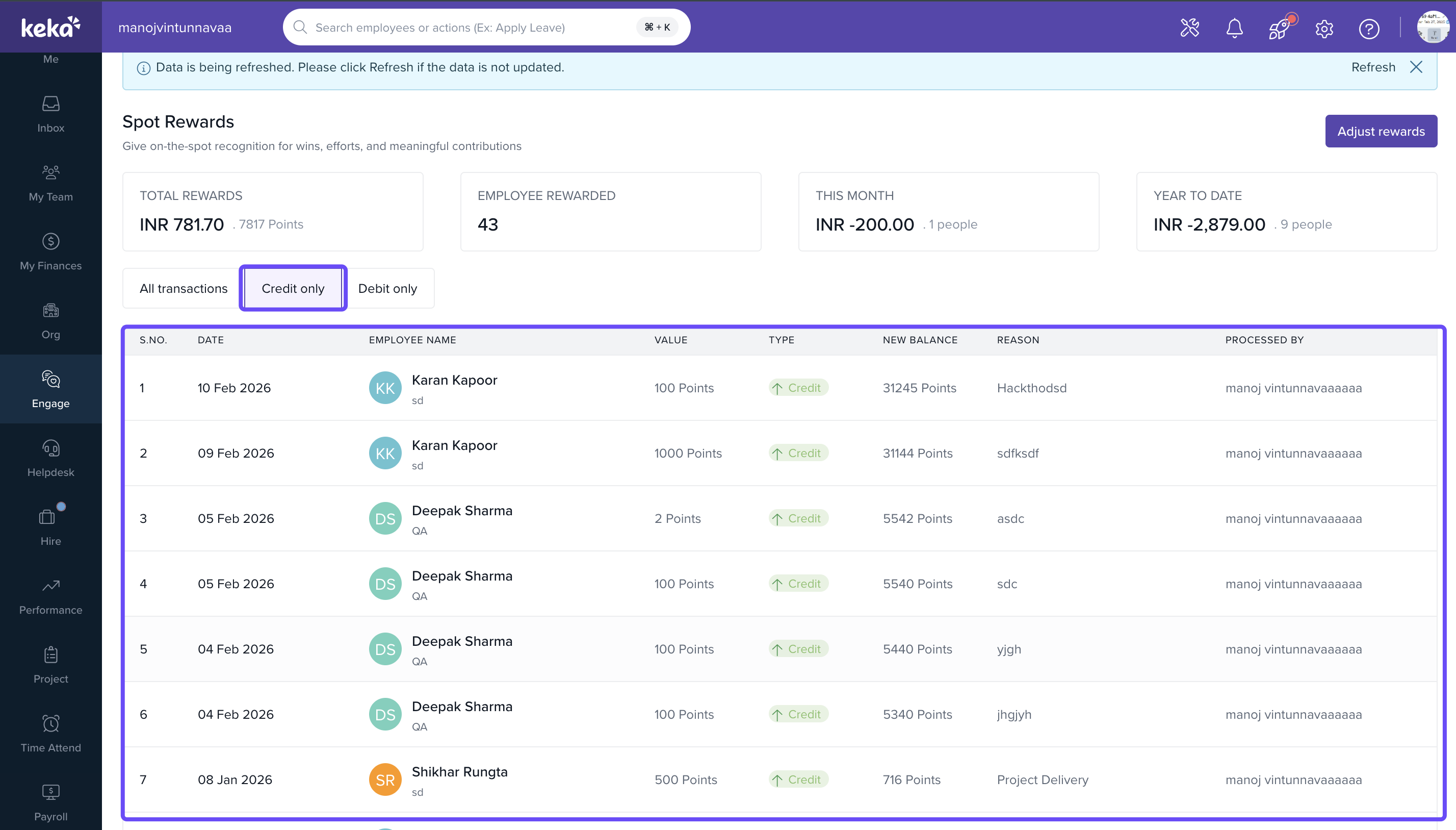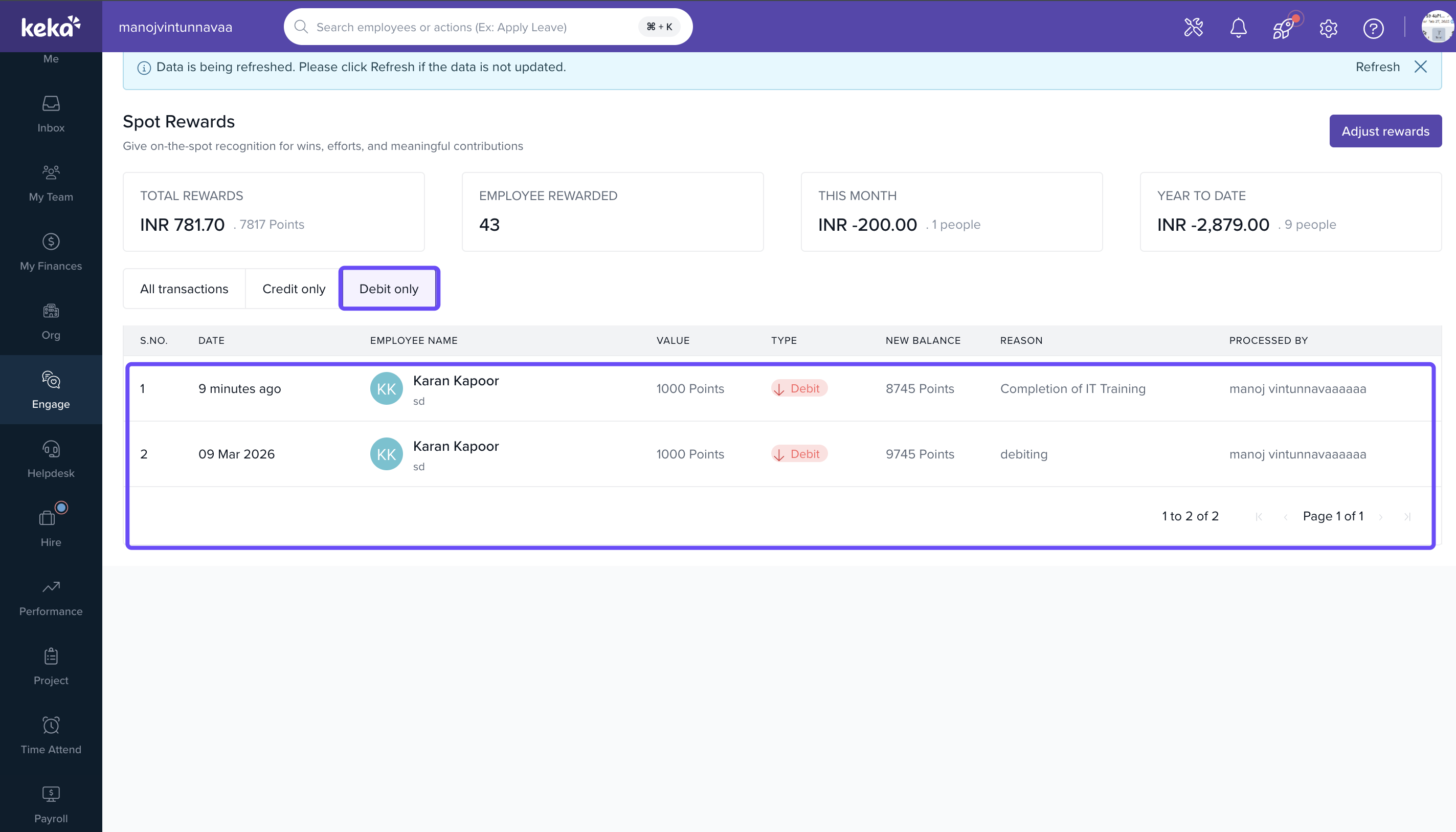 If employees redeem rewards outside the platform—such as requesting a gift card from HR—admins can debit the corresponding points to ensure the employee’s balance remains accurate.