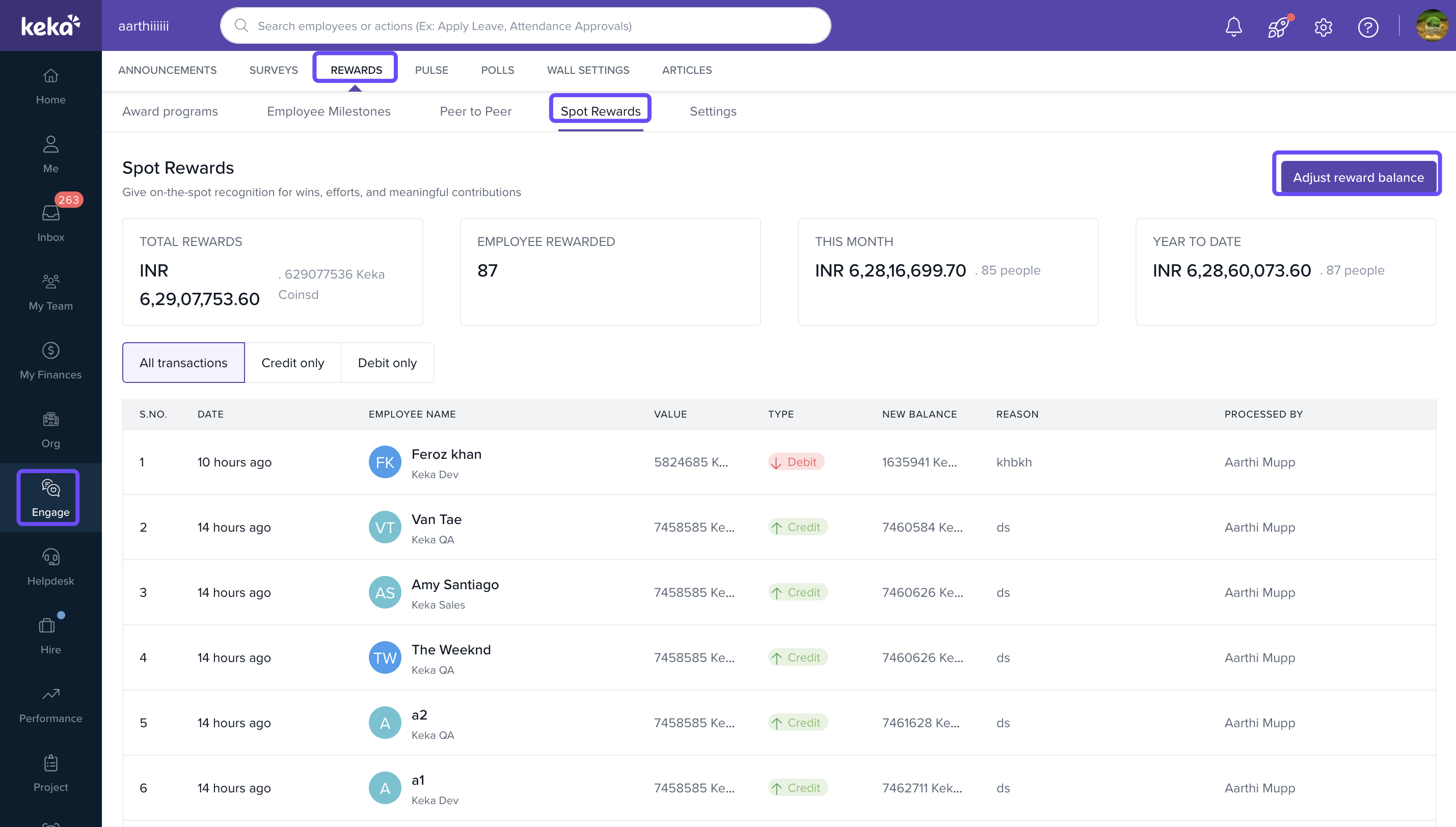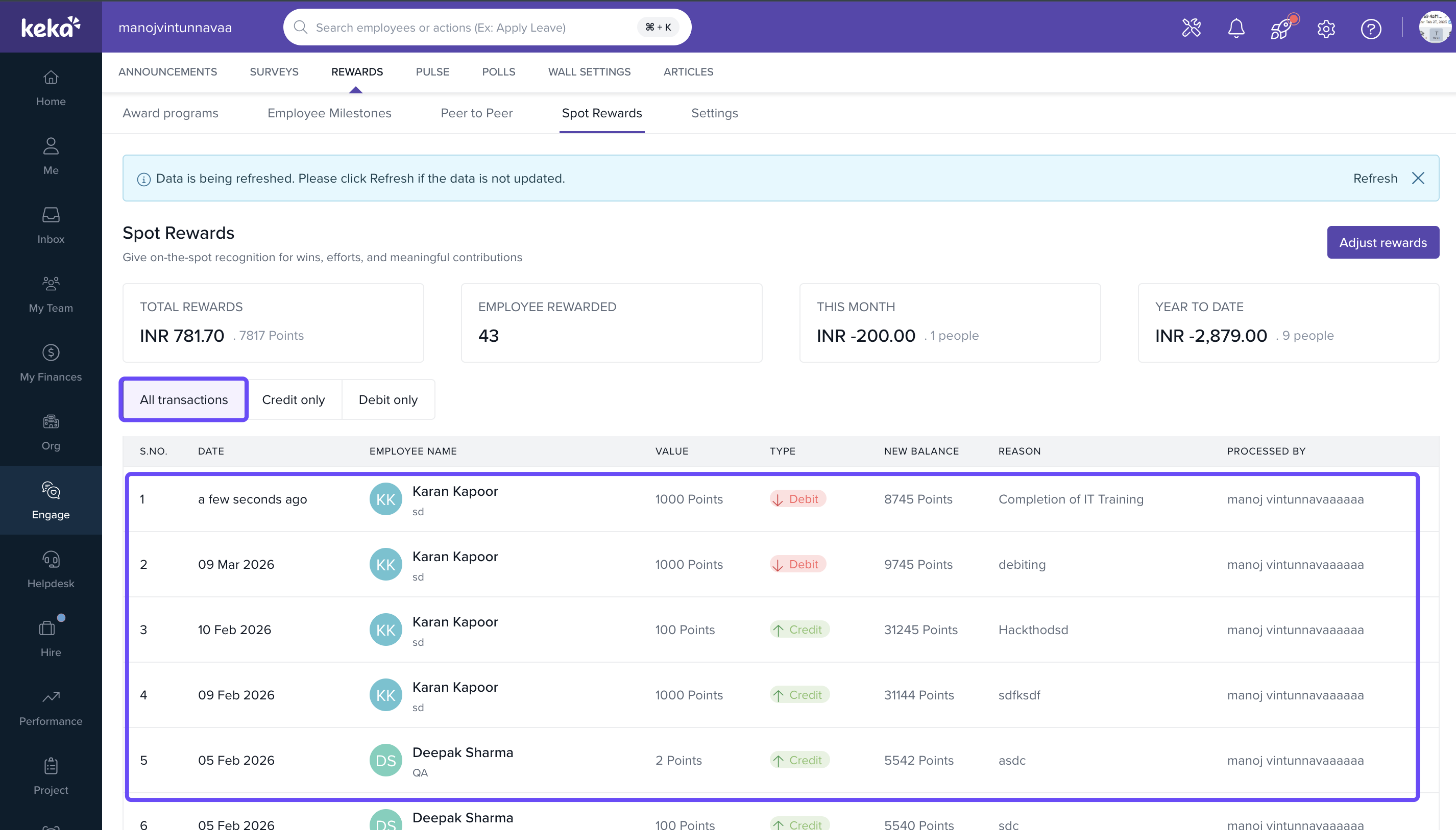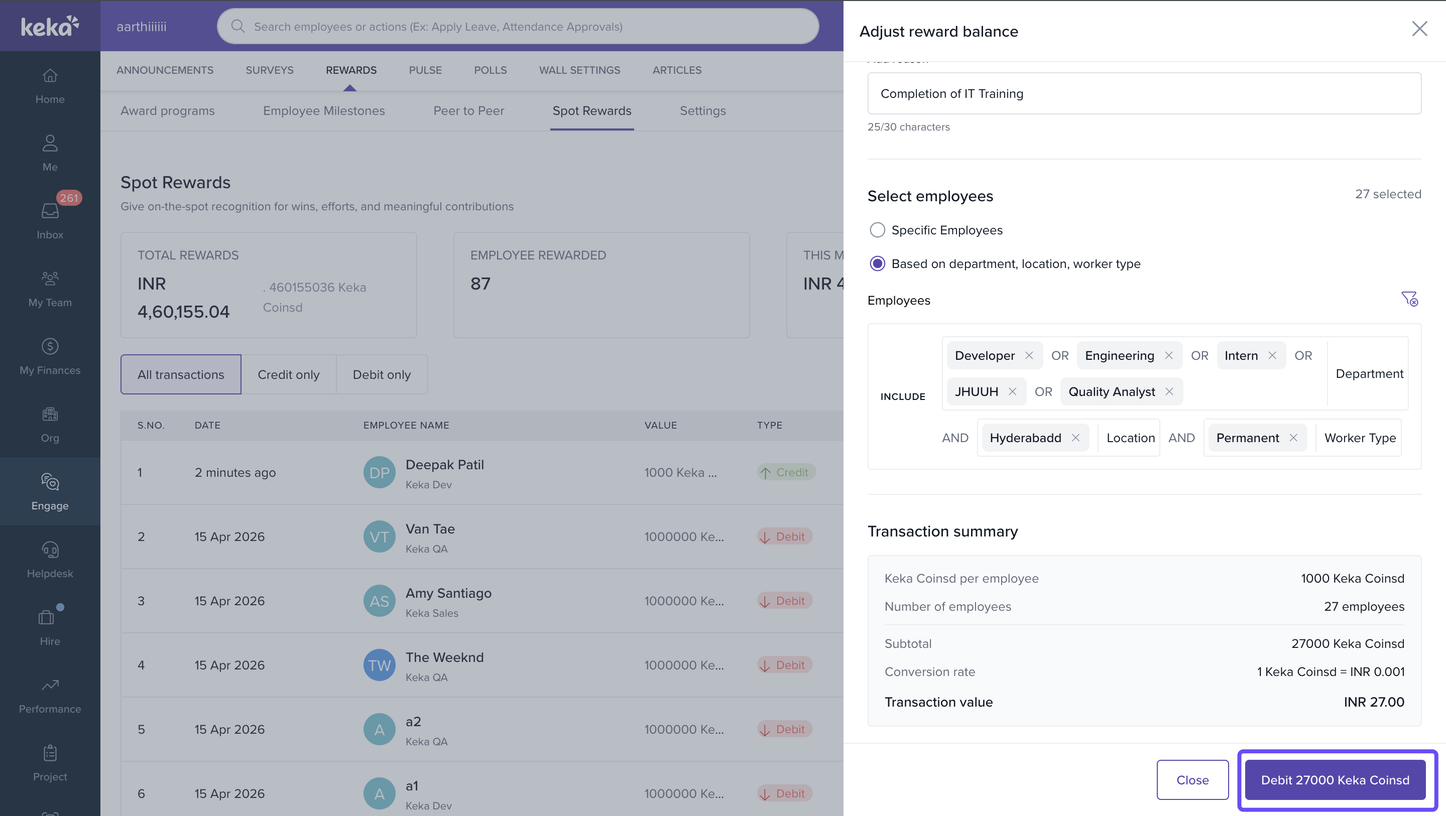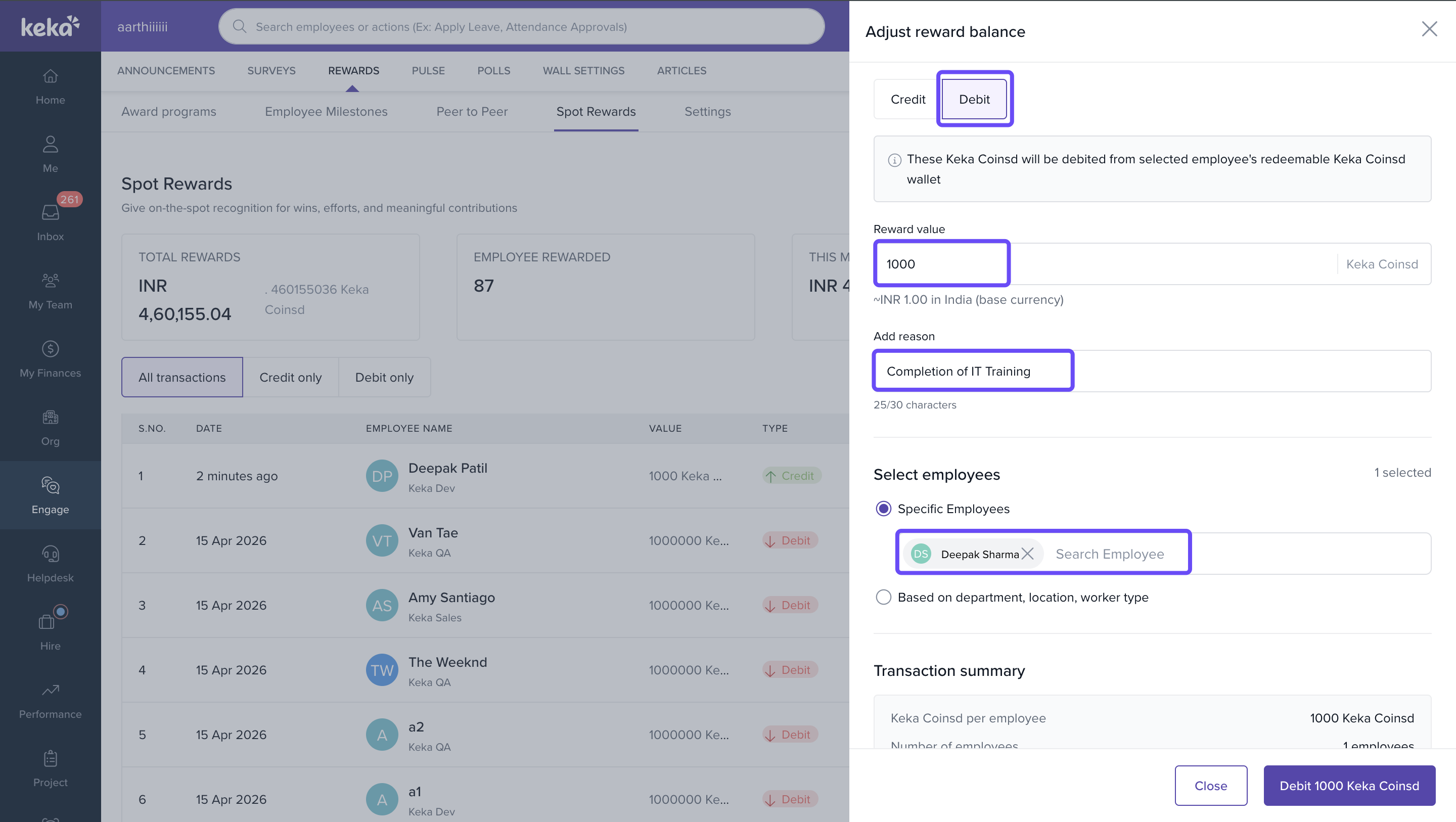 Tip: Always provide a clear reason for debiting points so employees can easily understand the deduction in their rewards history.