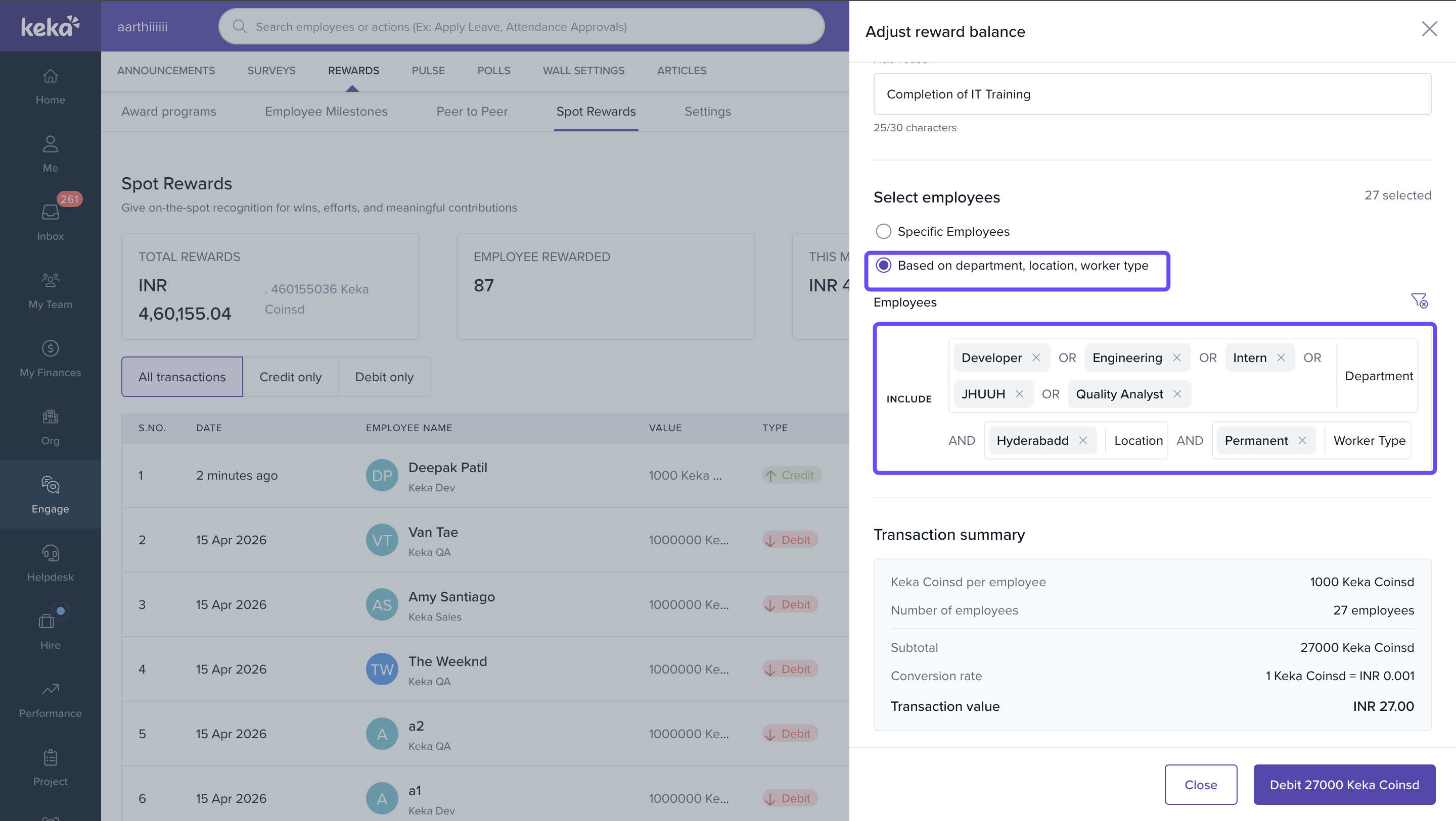 Admins can select one or more employees when debiting reward points. The same number of points and reason will be applied to all selected employees.