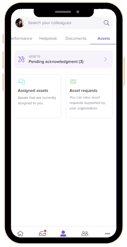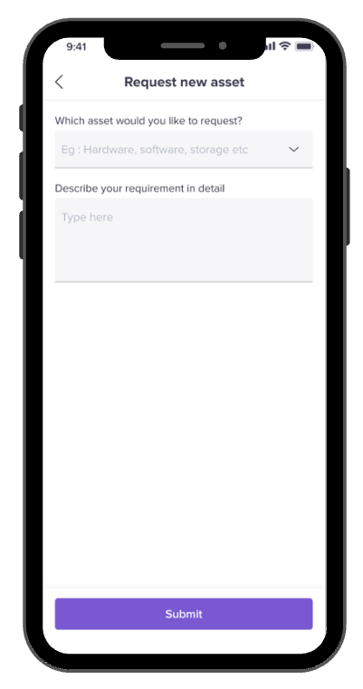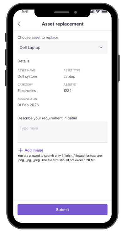 The Asset Request feature on the mobile app allows employees to raise new or replacement asset requests directly, without needing desktop access.
